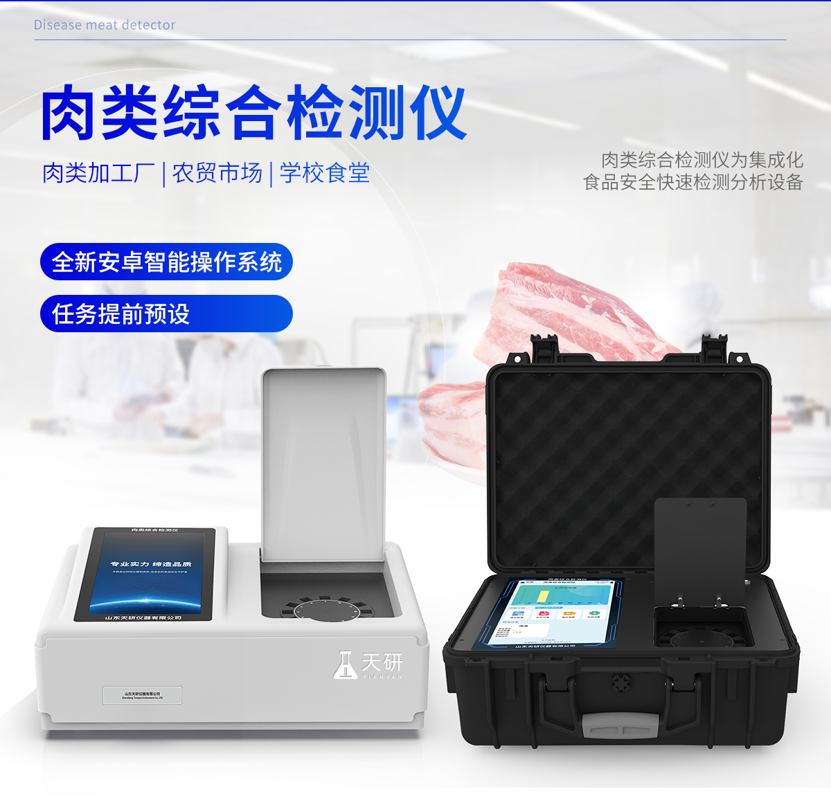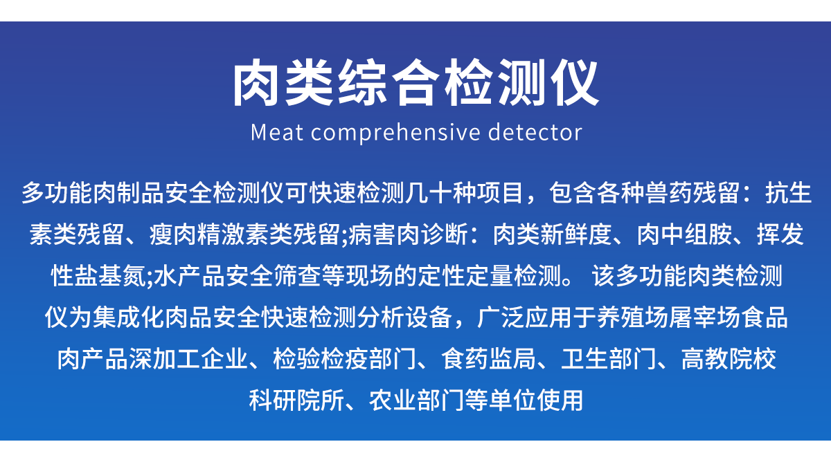 產(chǎn)品介紹: 肉類綜合檢測儀可快速檢測幾十種項目,包含各種獸藥殘留:抗生素類殘留、瘦肉精激素類殘留;病害肉診斷:肉類新鮮度、肉中組胺、揮發(fā)性鹽基氮;水產(chǎn)品安全篩查等現(xiàn)場的定性定量檢測。 該肉類綜合檢測儀為集成化肉品安全快速檢測分析設(shè)備,廣泛應(yīng)用于養(yǎng)殖場、屠宰場、食品肉產(chǎn)品深加工企業(yè)