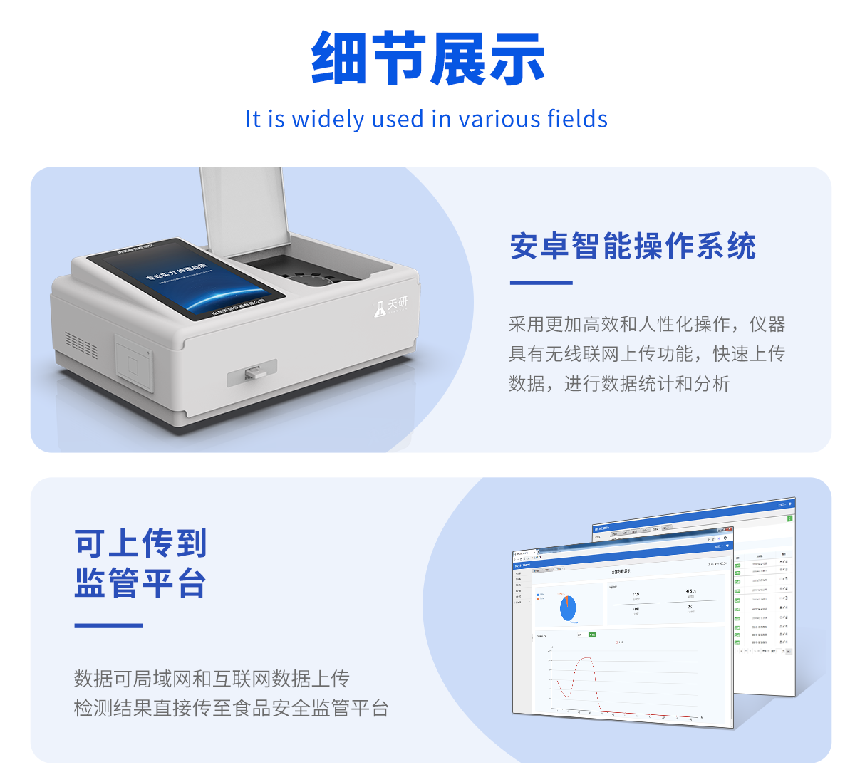 | 儀器采用臺式一體化系統(tǒng)檢測技術(shù),將分光光度模塊、膠體金檢測模塊、新型農(nóng)殘檢測模塊、數(shù)字化管理模塊、無線通訊模塊高度集成于一體,支持檢測200種食品安全檢測項目,同時預(yù)留升級檢測方法。 | 儀器檢測模塊標(biāo)準(zhǔn)化、智能化,可隨意自由組合。檢測箱體內(nèi)置多個標(biāo)準(zhǔn)檢測單元,檢測模塊可以調(diào)整配置。 | 儀器采用全新安卓智能系統(tǒng),主控芯片采用 ARM Cortex-A7,RK3288/4核處理器,10.1寸高清液晶觸摸豎屏,更加**的UI交互界面,運(yùn)轉(zhuǎn)快捷;儀器配備無線通信模塊: 4G(APN)通訊模塊、Wifi模塊,藍(lán)牙傳輸,同時具有雙USB接口以及RJ45接口能以多種方式實現(xiàn)數(shù)據(jù)保存和數(shù)據(jù)傳輸功能。 | 創(chuàng)新檢測模式: | ★檢測通道:≥12通道;采用精密旋轉(zhuǎn)比色池設(shè)計,使用同芯片同光源校準(zhǔn)精度,解決不同光源之間的誤差值。1-12通道間誤差0.1%。(**號:ZL202022821055.2) | ★儀器具有自動識別比色皿檢測功能,即:將樣品比色皿放入儀器后,點(diǎn)擊樣品檢測,儀器自動識別比色皿進(jìn)行通道檢測。 | 進(jìn)口高精光源: | 高精度進(jìn)口四波長冷光源,通道配置 410、520、590、630nm 波長光源,一個光源芯片驅(qū)動一個光源,誤差極小,每臺設(shè)備單獨(dú)**校準(zhǔn)光源,**比對,同時參照四種不同波段光源全方位覆蓋市面上99%的農(nóng)殘食品項目檢測。 | 膠體金模塊檢測方式: | 采用COMS實時成像技術(shù),可采集多個畫面,支持3個金標(biāo)同時讀卡,通過不同顏色的灰度變化,一秒精準(zhǔn)得出結(jié)果。 | 智能化操作系統(tǒng): | 便捷操作系統(tǒng):設(shè)備檢測時可在同一檢測界面自動對應(yīng)相關(guān)檢測通道一次性選擇1-12個樣品名稱,無須退出界面,節(jié)省操作時間。 | 數(shù)據(jù)集成系統(tǒng):設(shè)備首頁自動統(tǒng)計檢測數(shù)據(jù)包含:周檢測數(shù)據(jù)、月檢測數(shù)據(jù),全部檢測總數(shù)量,均包含檢測總數(shù),合格數(shù),不合格數(shù),以及相關(guān)柱形分析圖,對各項檢測數(shù)據(jù)清晰掌握,無需電腦查詢,更加快捷直觀。 | 項目預(yù)設(shè)系統(tǒng):支持添加單個及多個相同或不相同的任務(wù)預(yù)設(shè),一鍵快速調(diào)取,每一個任務(wù)分別可以設(shè)置不同的樣品、批次、編號、來源、備注、抽樣信息、檢測信息、受檢信息、復(fù)核信息等更多信息。無縫鏈接平臺和APP實時查看下發(fā)任務(wù)。 | 數(shù)據(jù)監(jiān)管系統(tǒng):同步對接監(jiān)管平臺,數(shù)據(jù)可局域網(wǎng)和互聯(lián)網(wǎng)數(shù)據(jù)上傳,檢測結(jié)果可選擇直接傳至食品安全監(jiān)管平臺。集成OSS輸出存儲服務(wù)、區(qū)分設(shè)備定向管理應(yīng)用,進(jìn)行區(qū)域食品安全監(jiān)管及大數(shù)據(jù)分析處理與數(shù)據(jù)統(tǒng)計,檢測區(qū)域食品安全長短期動態(tài),達(dá)到食品安全問題預(yù)估、預(yù)警。 | 自定義打印系統(tǒng):內(nèi)置全新打印系統(tǒng),新創(chuàng)自定義打印方式,可按需靈活設(shè)置開啟或關(guān)閉:產(chǎn)品合格證(國家農(nóng)業(yè)部標(biāo)準(zhǔn)要求),二維碼,抽樣信息、檢測信息,受檢信息、復(fù)核信息、抽樣日期、檢測日期等信息的打印。 | 系統(tǒng)遠(yuǎn)程更新功能:可定向分客戶分儀器更新系統(tǒng),按照不同客戶后期實際需求添加項目,無需機(jī)器返廠,即可遠(yuǎn)程實時升級全新系統(tǒng),節(jié)省時間成本及避免運(yùn)輸造成設(shè)備損壞。 | 儀器主機(jī)采用一體化防水、抗壓、防撞擊、防腐蝕箱體設(shè)計,同時配備交直流供電,可連接車載電源,可選配大容量充電鋰電池,滿足現(xiàn)場野外檢測需求。 | 安全證書,放心保障:儀器具有中國計量科學(xué)研究院校準(zhǔn)證書,**認(rèn)證。 |