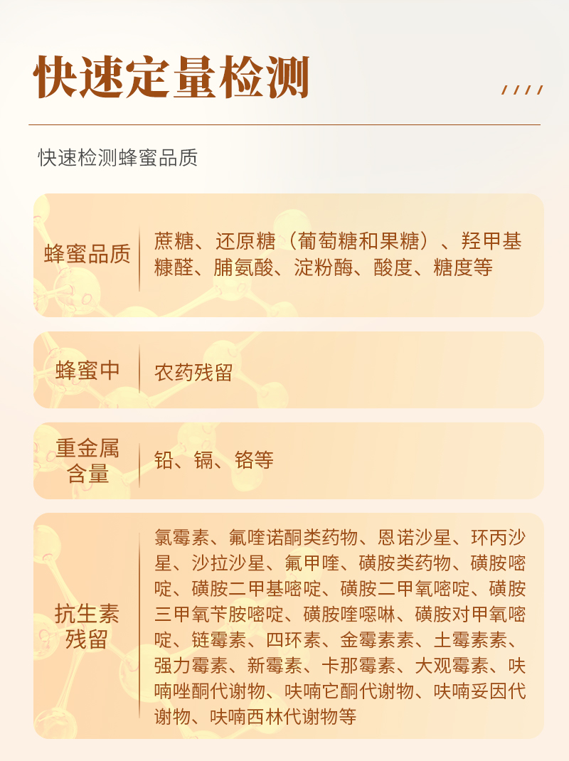 | 食品添加劑:二氧化硫、雙氧水、亞硝酸鹽、硝酸鹽、苯甲酸鈉、山梨酸鉀、糖精鈉、甜蜜素、木耳硫酸鎂等 | 有毒有害物質(zhì):甲醛、吊白塊、硼砂、過(guò)氧化苯甲酰、溴酸鉀、羅丹明B、三聚氰胺、蘇丹紅、工業(yè)堿、尿素、明礬等 | 食用油脂:過(guò)氧化值、酸價(jià)等 | 果蔬:農(nóng)藥殘留(酶抑制率法) | 病害肉:組胺、揮發(fā)性鹽基氮 | 重金屬含量:鉛、鎘、鉻、汞、砷、錫、鎳、鋁等 | 水酒飲品分析:酒中甲醇、乙醇、乳品及牛奶中蛋白質(zhì), | 蜂蜜成分:果糖和葡萄糖、蔗糖、淀粉酶、酸度等 | 調(diào)味品成分:食醋的總酸、醬油的總酸、芝麻油純度、谷氨酸鈉、醬油氨基酸態(tài)氮、食鹽中亞鐵氰化鉀、食鹽中碘等 | 食用色素類(lèi):紅色色素(胭脂紅、莧菜紅、莧菜紅)、黃色色素(檸檬黃、日落黃)、藍(lán)色色素(亮藍(lán))等 |