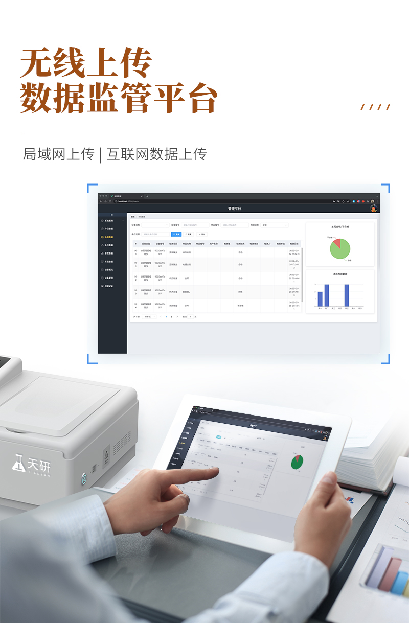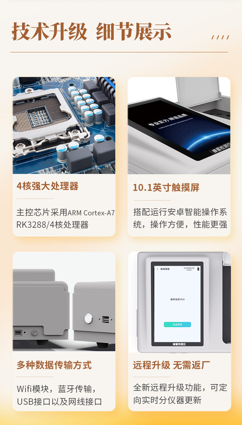 | 儀器采用手提一體化系統(tǒng)檢測技術(shù),將分光光度模塊、膠體金檢測模塊、新型農(nóng)殘檢測模塊、數(shù)字化管理模塊、無線通訊模塊高度集成于一體,支持檢測200種食品安全檢測項(xiàng)目,同時(shí)預(yù)留升級(jí)檢測方法。 | 儀器檢測模塊標(biāo)準(zhǔn)化、智能化,檢測項(xiàng)目可隨意自由組合。檢測箱體內(nèi)置多個(gè)標(biāo)準(zhǔn)檢測單元,檢測模塊可以調(diào)整配置。 | 顯示屏幕:儀器采用10.1英寸豎向液晶觸摸屏顯,搭配運(yùn)行安卓智能操作系統(tǒng),主控芯片采用ARM Cortex-A7,RK3288/4核處理器,主頻1.88Ghz,操作方便,性能更強(qiáng)。 | 檢測通道:≥12通道;采用精密旋轉(zhuǎn)比色池設(shè)計(jì),使用同芯片同光源校準(zhǔn)精度,解決不同光源之間的誤差值,更加準(zhǔn)確**。(1-12通道間誤差0.1%,**號(hào):ZL202022821055.2) | 儀器光源:高精度進(jìn)口四波長冷光源,每個(gè)通道均配置 410、520、590、630nm 波長光源,標(biāo)配**的光路切換裝置,**光路切換功能可實(shí)現(xiàn)64波長,并且所有檢測項(xiàng)目可實(shí)現(xiàn)所有通道同時(shí)檢測。 | 設(shè)備可一鍵校準(zhǔn),自動(dòng)保存校準(zhǔn)數(shù)據(jù),自動(dòng)對比校驗(yàn),得到精準(zhǔn)光源,采用Android SP存儲(chǔ)數(shù)據(jù),光源數(shù)據(jù)永不丟失,方便每一次使用。 | 通訊接口:配備無線通信模塊、4G(APN)通訊模塊、藍(lán)牙傳輸,同時(shí)具有雙USB接口以及RJ45網(wǎng)線接口,可以多方式實(shí)現(xiàn)數(shù)據(jù)保存及數(shù)據(jù)傳輸。 | 存儲(chǔ)方式:支持U盤存儲(chǔ),標(biāo)準(zhǔn)USB接口,免驅(qū)動(dòng)安裝。檢測結(jié)果存儲(chǔ)容量20萬條以上,可生成Excel表格進(jìn)行拷貝,并具有登錄保護(hù)功能。 | 智能化操作系統(tǒng):: ★操作系統(tǒng):儀器可在同一檢測界面自動(dòng)對應(yīng)相關(guān)檢測通道,一次性選擇1-12個(gè)樣品名稱,無需退出界面,節(jié)省操作時(shí)間。并可以對每個(gè)通道屬性和樣品信息單獨(dú)進(jìn)行編輯,例如送檢單位、人員,檢測人員等,打印時(shí)勾選打印顯示。 | ★數(shù)據(jù)集成系統(tǒng):設(shè)備首頁自動(dòng)匯總分析檢測數(shù)據(jù),包含:周檢測數(shù)據(jù)、月檢測數(shù)據(jù),全部檢測總數(shù)量,均包含檢測總數(shù),合格數(shù),不合格數(shù),以及相關(guān)柱形分析圖,各項(xiàng)檢測數(shù)據(jù)一目了然,無需電腦查詢,更加快捷直觀。 | ★數(shù)據(jù)庫系統(tǒng):十幾項(xiàng)數(shù)據(jù)庫分類管理儀器:包含項(xiàng)目類型、項(xiàng)目數(shù)據(jù)、檢測數(shù)據(jù)、歷史記錄、國標(biāo)信息、曲線信息、采樣信息、檢測信息、受檢信息、復(fù)核信息、圖表信息、光源校準(zhǔn)信息、打印樣式信息、樣品庫信息等等,數(shù)據(jù)庫之間互相協(xié)調(diào)聯(lián)動(dòng)保證數(shù)據(jù)的真實(shí)完整性。同時(shí)產(chǎn)品數(shù)據(jù)庫以及歷史檢測記錄支持一鍵檢索功能。 | ★限量規(guī)判系統(tǒng):具有限量查詢、添加物質(zhì)合規(guī)判定系統(tǒng)。檢測出結(jié)果后,系統(tǒng)自動(dòng)調(diào)用系統(tǒng)數(shù)據(jù)庫中相關(guān)國標(biāo)進(jìn)行比對判定,客觀顯示判定結(jié)果是否合格 | ★項(xiàng)目預(yù)設(shè)系統(tǒng):儀器具有任務(wù)預(yù)設(shè)模塊,一鍵提前預(yù)設(shè),給出方便快捷的新檢測方案,每一個(gè)任務(wù)分別可以設(shè)置不同的樣品、批次、編號(hào)、來源、備注、抽樣信息、檢測信息、受檢信息、復(fù)核信息等更多信息。樣品送檢時(shí)一鍵調(diào)取保存信息,并可多次調(diào)取,大大提高檢測效率。 | ★數(shù)據(jù)監(jiān)管系統(tǒng):同步對接監(jiān)管平臺(tái),數(shù)據(jù)可局域網(wǎng)和互聯(lián)網(wǎng)數(shù)據(jù)上傳,檢測結(jié)果可選擇直接傳至食品安全監(jiān)管平臺(tái)。進(jìn)行區(qū)域食品安全監(jiān)管及大數(shù)據(jù)分析處理與數(shù)據(jù)統(tǒng)計(jì),檢測區(qū)域食品安全長短期動(dòng)態(tài),達(dá)到食品安全問題預(yù)估、預(yù)警。 | ★打印系統(tǒng):內(nèi)置全新打印機(jī),新創(chuàng)自定義打印方式,可按需靈活勾選控制:產(chǎn)品合格證(國家農(nóng)業(yè)部標(biāo)準(zhǔn)要求),二維碼,抽樣信息、檢測信息,受檢信息、復(fù)核信息、抽樣日期、檢測日期等信息的打印。 | 供電模式:儀器交直流兩用,直流12V供電,可連接車載電源,可配6ah大容量充電鋰電池,電量可實(shí)時(shí)顯示,方便戶外流動(dòng)測試。 | 膠體金檢測模塊:采用雙通道CMOS成像處理技術(shù)及膠體金免疫層析技術(shù),可同時(shí)讀取雙膠體金卡數(shù)據(jù),自動(dòng)采集、處理分析,將檢測結(jié)果顯示,并可根據(jù)參考限值自動(dòng)判斷檢測結(jié)果,可檢測常見的獸藥殘留、生物毒素、抗生素、違禁添加物等。 | ★探測技術(shù):CMOS成像探測; | ★檢測通道:1個(gè)通道; | ★檢測方式:消線法和比色法; | ★顯示模式:陰性或陽性; | 曲線形式:軌道式掃描方式,顯示金標(biāo)卡圖像,實(shí)時(shí)生成、識(shí)別CT曲線圖,無需手動(dòng)調(diào)整,完成檢測后自動(dòng)退出檢測卡。兼容市場上其他金標(biāo)卡,使用耗材不受限制。 | 儀器具備遠(yuǎn)程升級(jí)功能,可定向分客戶分儀器更新,開機(jī