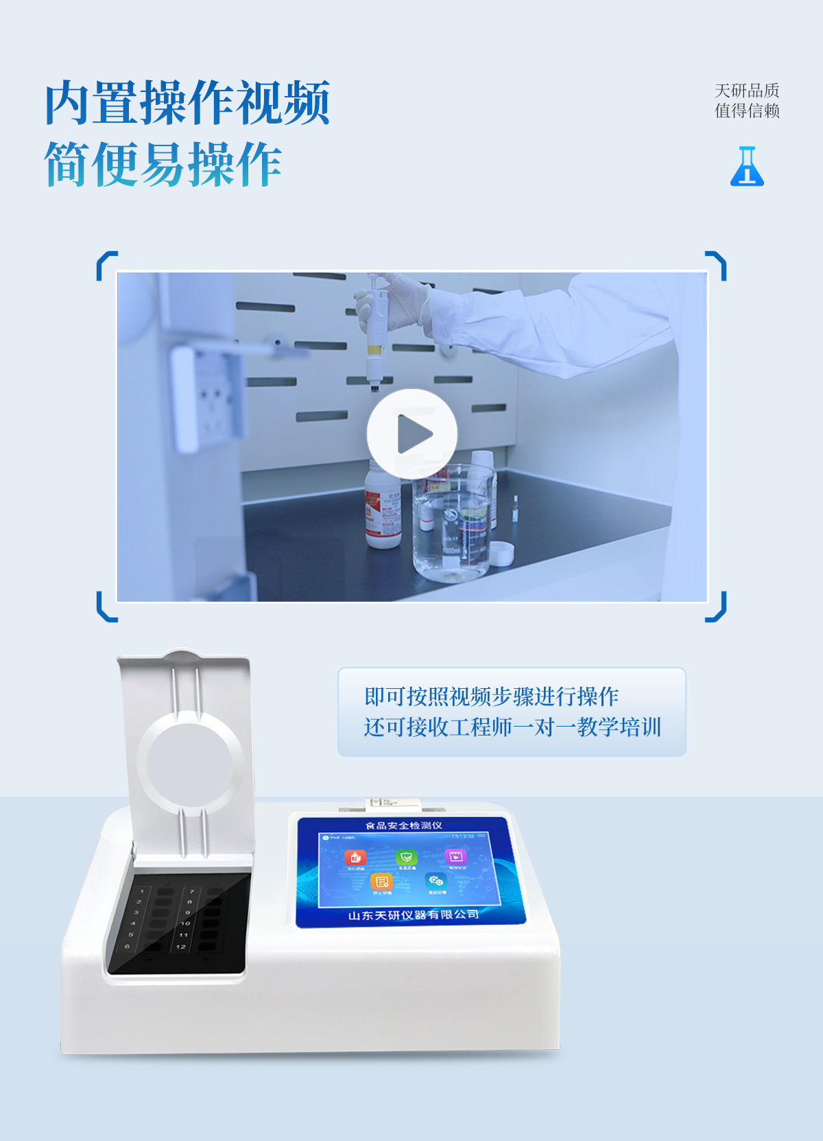 產(chǎn)品介紹: 多功能食品安全檢測儀可快速檢測200多項目,包含非食用化學物質、濫用食品添加劑、農(nóng)藥殘留、獸藥殘留、重金屬、病害肉、營養(yǎng)強化劑、抗生素類殘留、激素類殘留、真菌毒素類殘留、化學類殘留等現(xiàn)場的定性定量檢測。該多功能食品安全檢測儀為集成化食品安全快速檢測分析設備,廣泛應用于市場