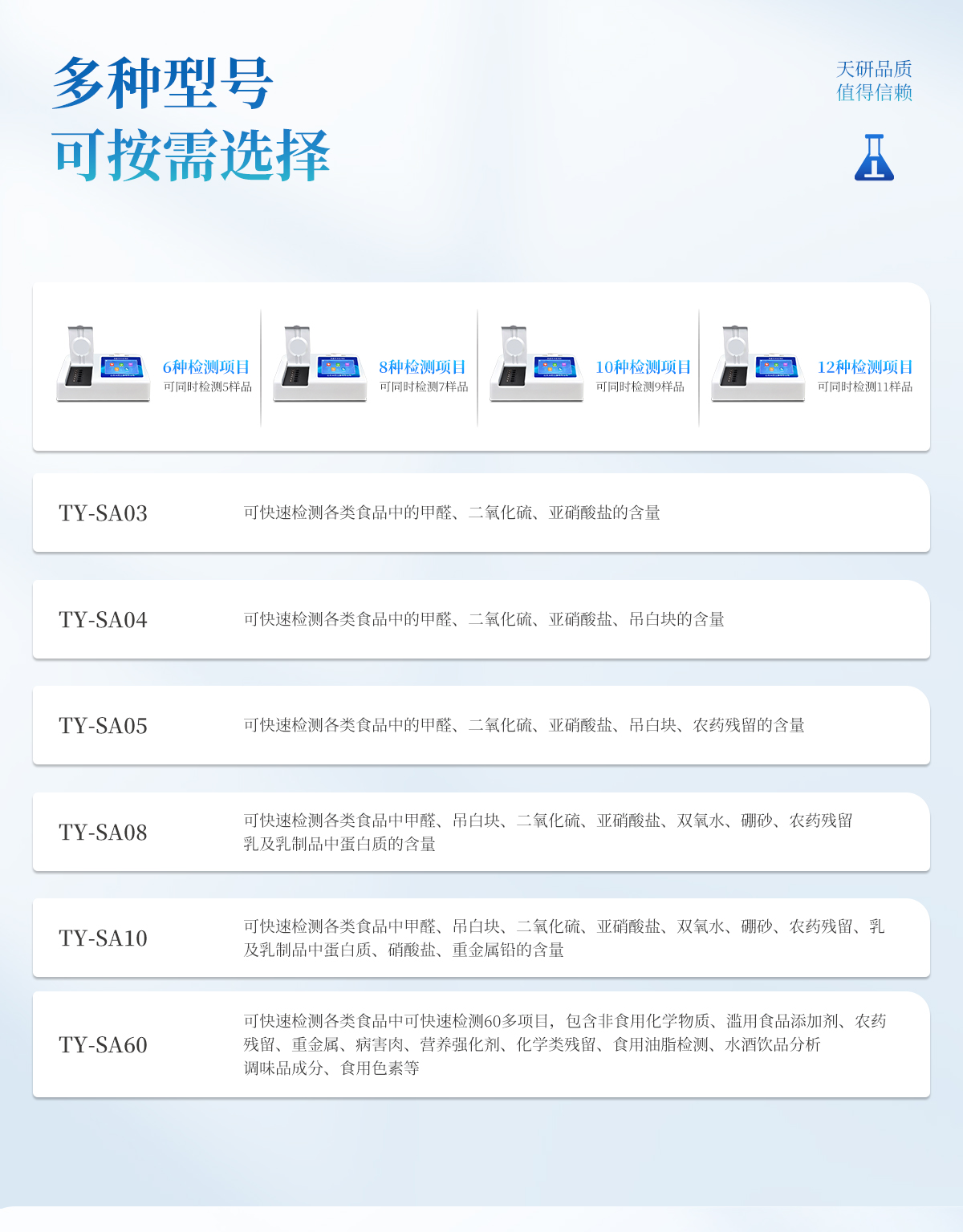 可快速檢測各類食品中的甲醛、二氧化硫、亞硝酸鹽、吊白塊的含量,儀器預留其他項目檢測程序和端口,根據(jù)日后需求可方便的自主增加檢測項目。
