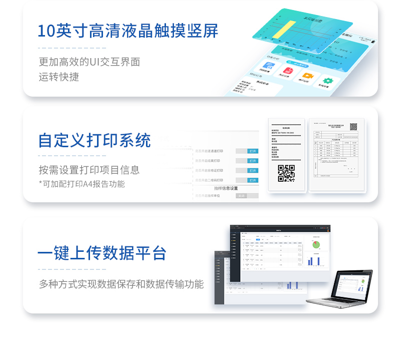 | 安卓智能操作系統(tǒng),采用更加**和人性化操作,儀器具有無線聯(lián)網(wǎng)上傳功能,快速上傳數(shù)據(jù),進(jìn)行數(shù)據(jù)統(tǒng)計(jì)和分析。 | 智能化程度高,儀器具有自檢功能:具有開機(jī)自檢和調(diào)零功能,具有自動(dòng)檢測(cè)重復(fù)性功能;同時(shí),檢測(cè)完成可自動(dòng)打印檢測(cè)報(bào)告和二維碼。手機(jī)掃碼可顯示出詳細(xì)檢測(cè)信息。 | 儀器帶有監(jiān)管平臺(tái),數(shù)據(jù)可局域網(wǎng)和互聯(lián)網(wǎng)數(shù)據(jù)上傳,檢測(cè)結(jié)果直接傳至食品安全監(jiān)管平臺(tái)。進(jìn)行區(qū)域食品安全監(jiān)管及大數(shù)據(jù)分析處理與數(shù)據(jù)統(tǒng)計(jì),檢測(cè)區(qū)域食品安全長短期動(dòng)態(tài),達(dá)到食品安全問題預(yù)估、預(yù)警 。 | 樣品處理簡(jiǎn)單省力,整體操作快速、安全、便捷。 | 儀器具有自身保護(hù)功能,可設(shè)置用戶名及密碼,防止非工作人員操作等。 | 內(nèi)置強(qiáng)大的數(shù)據(jù)庫,可在儀器上直接選擇樣品名稱、檢測(cè)指標(biāo)、送檢單位等信息,也可在儀器上直接編輯錄入樣品名稱、檢測(cè)指標(biāo)、送檢單位等信息并保存進(jìn)樣品數(shù)據(jù)庫,方便后期操作調(diào)取使用。 | 儀器具有重新校準(zhǔn)、鎖定、恢復(fù)出廠設(shè)置功能。 |