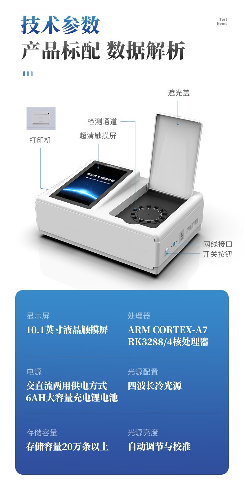 | 儀器采用臺式一體化系統(tǒng)檢測技術(shù),將分光光度模塊、新型農(nóng)殘檢測模塊、數(shù)字化管理模塊、無線通訊模塊高度集成于一體,支持檢測200種食品安全檢測項目,同時預(yù)留升級檢測方法。 | 儀器檢測模塊標(biāo)準(zhǔn)化、智能化,可隨意自由組合。檢測箱體內(nèi)置多個標(biāo)準(zhǔn)檢測單元,檢測模塊可以調(diào)整配置。 | 儀器采用全新安卓智能系統(tǒng),主控芯片采用 ARM Cortex-A7,RK3288/4核處理器,10.1寸高清液晶觸摸豎屏,更加**的UI交互界面,運(yùn)轉(zhuǎn)快捷;儀器配備無線通信模塊: 4G(APN)通訊模塊、Wifi模塊,藍(lán)牙傳輸,同時具有雙USB接口以及RJ45接口能以多種方式實(shí)現(xiàn)數(shù)據(jù)保存和數(shù)據(jù)傳輸功能。 | 創(chuàng)新檢測模式: | ★檢測通道:≥12通道;采用精密旋轉(zhuǎn)比色池設(shè)計,使用同芯片同光源校準(zhǔn)精度,解決不同光源之間的誤差值。1-12通道間誤差0.1%。(**號:ZL202022821055.2) | ★儀器具有自動識別比色皿檢測功能,即:將樣品比色皿放入儀器后,點(diǎn)擊樣品檢測,儀器自動識別比色皿進(jìn)行通道檢測。 | 進(jìn)口高精光源: | 高精度進(jìn)口四波長冷光源,通道配置 410、520、590、630nm 波長光源,一個光源芯片驅(qū)動一個光源,誤差極小,每臺設(shè)備單獨(dú)**校準(zhǔn)光源,**比對,同時參照四種不同波段光源全方位覆蓋市面上99%的農(nóng)殘食品項目檢測。 | 智能化操作系統(tǒng): | 便捷操作系統(tǒng):設(shè)備檢測時可在同一檢測界面自動對應(yīng)相關(guān)檢測通道一次性選擇1-12個樣品名稱,無須退出界面,節(jié)省操作時間。 | 數(shù)據(jù)集成系統(tǒng):設(shè)備首頁自動統(tǒng)計檢測數(shù)據(jù)包含:周檢測數(shù)據(jù)、月檢測數(shù)據(jù),全部檢測總數(shù)量,均包含檢測總數(shù),合格數(shù),不合格數(shù),以及相關(guān)柱形分析圖,對各項檢測數(shù)據(jù)清晰掌握,無需電腦查詢,更加快捷直觀。 | 項目預(yù)設(shè)系統(tǒng):支持添加單個及多個相同或不相同的任務(wù)預(yù)設(shè),一鍵快速調(diào)取,每一個任務(wù)分別可以設(shè)置不同的樣品、批次、編號、來源、備注、抽樣信息、檢測信息、受檢信息、復(fù)核信息等更多信息。無縫鏈接平臺和APP實(shí)時查看下發(fā)任務(wù)。 | 數(shù)據(jù)監(jiān)管系統(tǒng):同步對接監(jiān)管平臺,數(shù)據(jù)可局域網(wǎng)和互聯(lián)網(wǎng)數(shù)據(jù)上傳,檢測結(jié)果可選擇直接傳至食品安全監(jiān)管平臺。集成OSS輸出存儲服務(wù)、區(qū)分設(shè)備定向管理應(yīng)用,進(jìn)行區(qū)域食品安全監(jiān)管及大數(shù)據(jù)分析處理與數(shù)據(jù)統(tǒng)計,檢測區(qū)域食品安全長短期動態(tài),達(dá)到食品安全問題預(yù)估、預(yù)警。 | 自定義打印系統(tǒng):內(nèi)置全新打印系統(tǒng),新創(chuàng)自定義打印方式,可按需靈活設(shè)置開啟或關(guān)閉:產(chǎn)品合格證(國家農(nóng)業(yè)部標(biāo)準(zhǔn)要求),二維碼,抽樣信息、檢測信息,受檢信息、復(fù)核信息、抽樣日期、檢測日期等信息的打印。 | 系統(tǒng)遠(yuǎn)程更新功能:可定向分客戶分儀器更新系統(tǒng),按照不同客戶后期實(shí)際需求添加項目,無需機(jī)器返廠,即可遠(yuǎn)程實(shí)時升級全新系統(tǒng),節(jié)省時間成本及避免運(yùn)輸造成設(shè)備損壞。 | 儀器主機(jī)采用一體化防水、抗壓、防撞擊、防腐蝕箱體設(shè)計,同時配備交直流供電,可連接車載電源,可選配大容量充電鋰電池,滿足現(xiàn)場野外檢測需求。 | 安全證書,放心保障:儀器具有中國計量科學(xué)研究院校準(zhǔn)證書,**認(rèn)證。 |