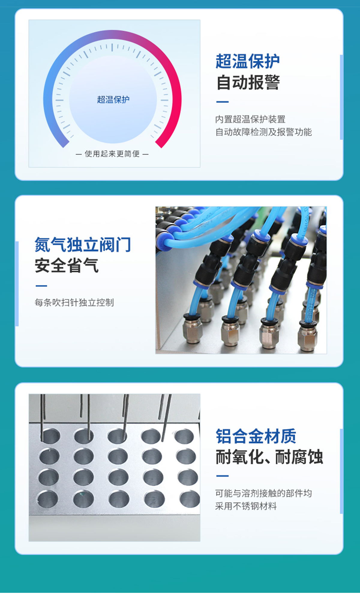 檢測(cè)項(xiàng)目: 水浴氮吹儀采用吹掃捕集技術(shù),同時(shí)可對(duì)樣品進(jìn)行控溫加熱,利用氮?dú)獾榷栊詺怏w快速、可控、連續(xù)地吹到樣品表面來(lái)達(dá)到樣品溶液快速無(wú)氧濃縮。該方法具有省時(shí)、便捷、準(zhǔn)確的特點(diǎn)。廣泛用于食品安全、醫(yī)藥、農(nóng)藥殘留檢測(cè)、臨床藥代等領(lǐng)域。 產(chǎn)品特點(diǎn):
