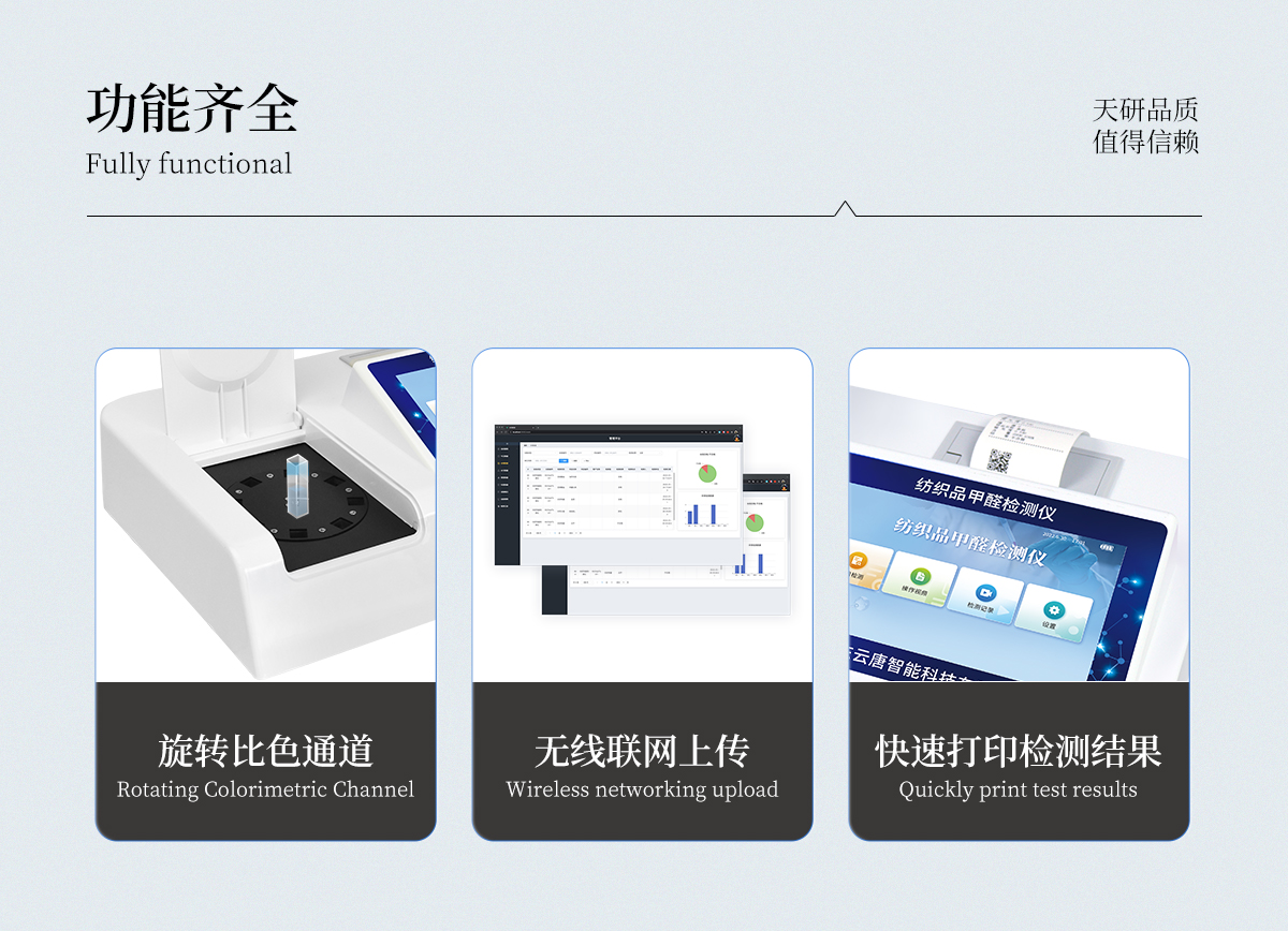 該紡織品甲醛檢測系統(tǒng)與質(zhì)檢、商檢機構(gòu)采用同樣執(zhí)行標準、檢測方法,專業(yè)為廣大紡織品、服裝等生產(chǎn)企業(yè)、質(zhì)檢商檢單位提供“一站式服務”,同時為各類紡織品甲醛實驗室提供專業(yè)的解決方案。