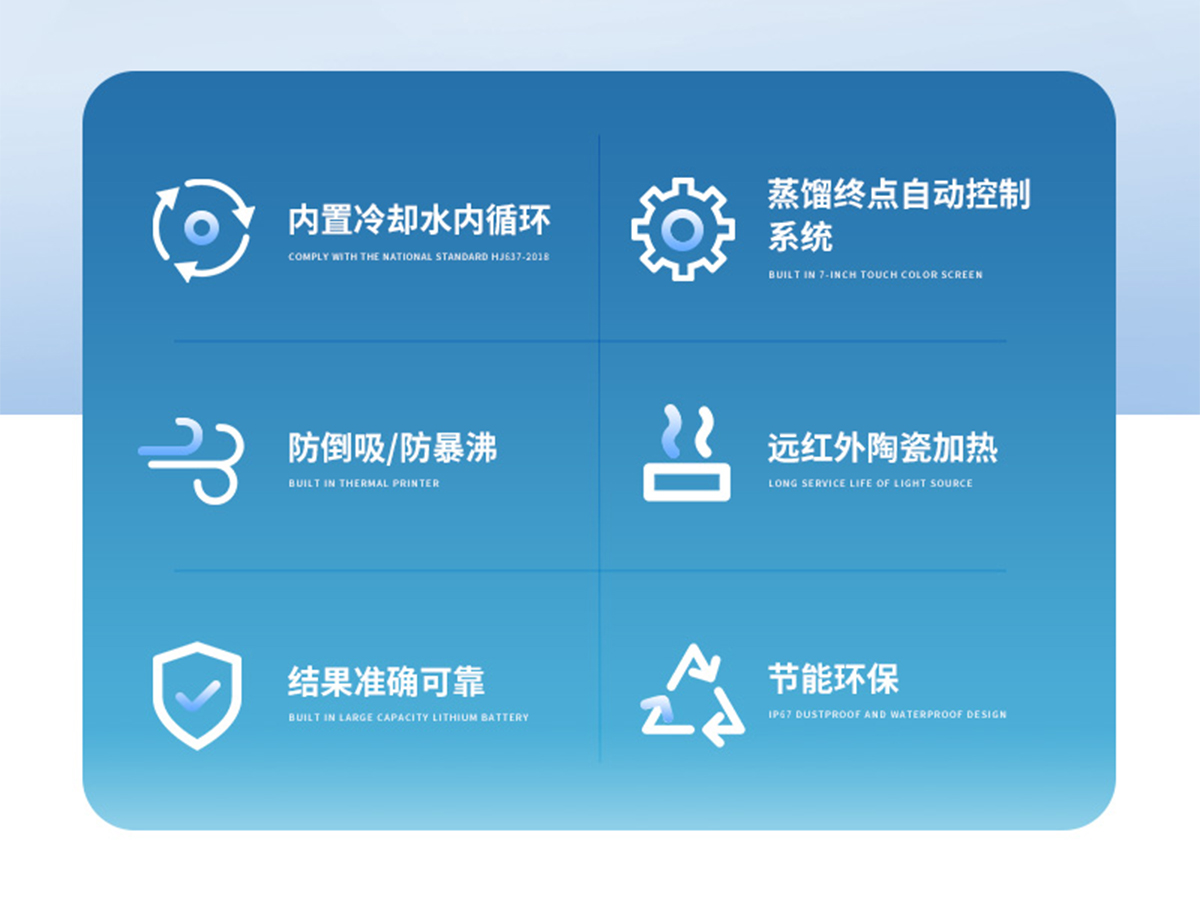 該儀器實(shí)驗(yàn)了控溫、自動(dòng)防倒吸、加熱均勻、防止暴沸、智能終點(diǎn)控制等功能。使用方便,節(jié)能環(huán)保。經(jīng)過(guò)實(shí)驗(yàn)室蒸餾回收率比對(duì)驗(yàn)證,結(jié)果準(zhǔn)確,回收率達(dá)95%以上。該儀器可廣泛適用于環(huán)保、疾控、水產(chǎn)、供排水、高校、科研院所、廠礦企業(yè)等各類化學(xué)實(shí)驗(yàn)室需要蒸餾處理的場(chǎng)所,如揮發(fā)酚、氨氮、凱氏氮油中水分等項(xiàng)目的蒸餾處理。