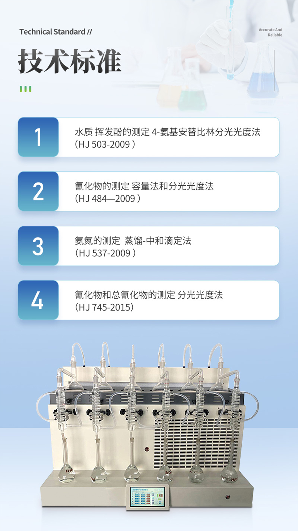 | 食品中二氧化硫殘留量、酒精度的蒸餾前處理項(xiàng)目 | 1.水質(zhì) 揮發(fā)酚的測(cè)定 4-氨基安替比林分光光度法(HJ 503-2009 ) | 2.水質(zhì) 青化物的測(cè)定 容量法和分光光度法(HJ 484—2009 ) | 3.水質(zhì) 氨氮的測(cè)定 蒸餾-中和滴定法(HJ 537-2009 ) | 4.土壤 青化物和總青化物的測(cè)定 分光光度法(HJ 745-2015) |