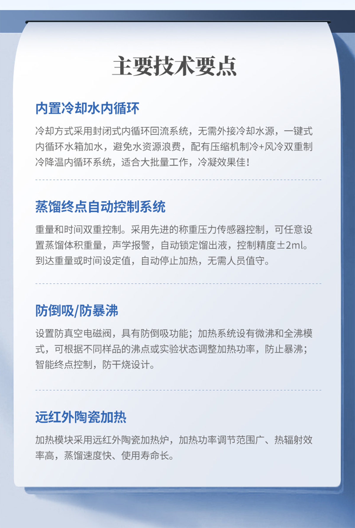 | 1、加熱方式:采用遠(yuǎn)紅外陶瓷加熱爐,紅外線輻射加熱(無(wú)明火加熱、防水); | 2、加熱單元:6個(gè),可單孔單控制; | 3、升溫時(shí)間:5-8min; | 4、蒸餾速度:2-12ml/min; | 5、蒸餾終點(diǎn)控制:自動(dòng)偵測(cè)蒸餾終點(diǎn)功能,采用稱重和時(shí)間雙重控制,蒸餾體積控制在±2ml之內(nèi),自動(dòng)化程度高; | 6、單爐加熱功率:0-450W(單孔可調(diào)); | 7、加熱功率:0-2700W(可調(diào)); | 8、冷卻方式:封閉式內(nèi)循環(huán)回流系統(tǒng),也可外接冷卻水源; | 9、防倒吸:設(shè)有防真空電磁閥,具有防倒吸功能; | 10、時(shí)間控制:0-200min可調(diào); | 11、蒸餾瓶規(guī)格:500mlX6,250 X6 更多規(guī)格可選; | 12、額定電壓/頻率:220V/50HZ; |