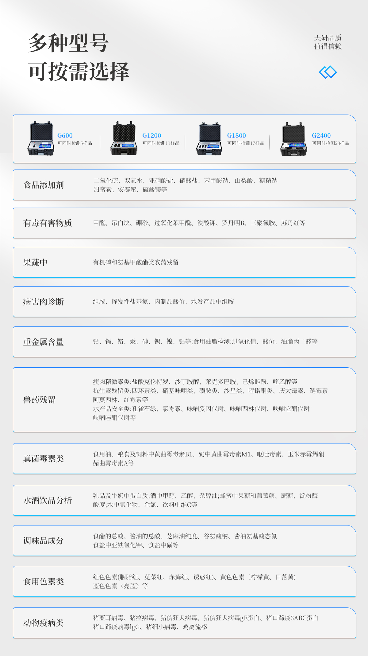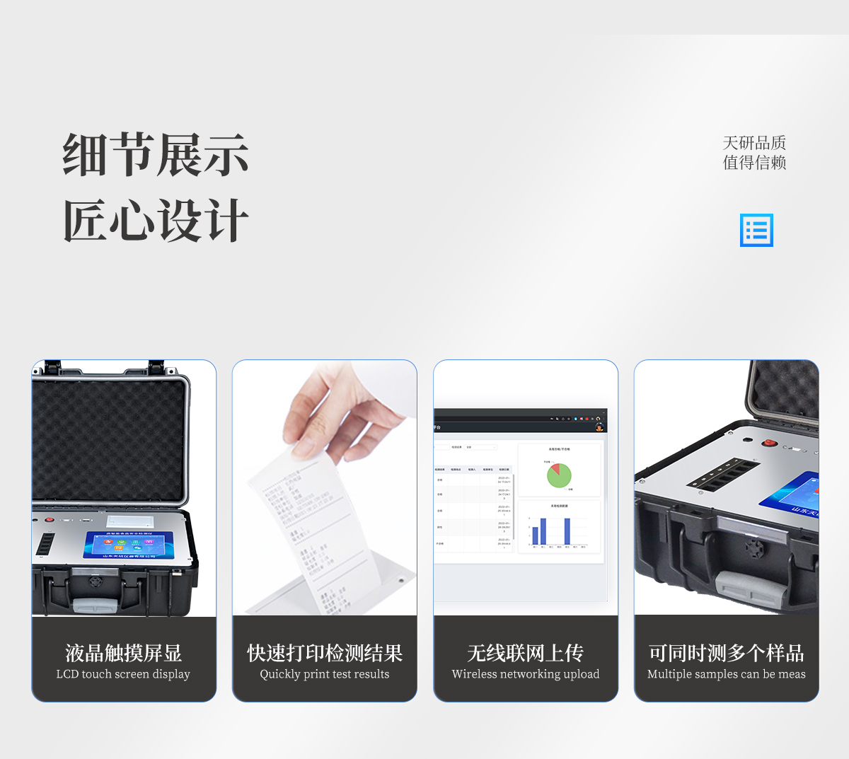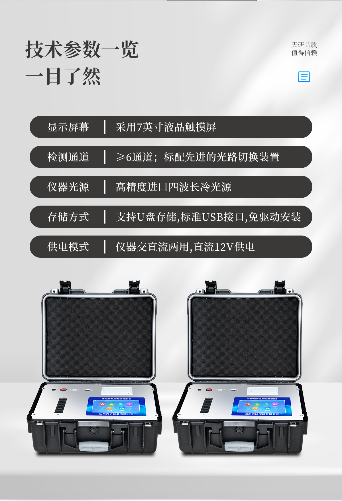 | 儀器采用手提式一體化系統(tǒng)檢測技術(shù),將分光光度模塊、新型農(nóng)殘檢測模塊、數(shù)字化管理模塊、無線通訊模塊高度集成于一體,支持檢測200種食品安全檢測項目,同時預(yù)留升級檢測方法。 | 儀器檢測模塊標準化、智能化,檢測項目可隨意自由組合。檢測箱體內(nèi)置多個標準檢測單元,檢測模塊可以調(diào)整配置。 | 顯示屏幕:儀器采用10.1英寸豎向液晶觸摸屏顯,搭配運行安卓智能操作系統(tǒng),主控芯片采用ARM Cortex-A7,RK3288/4核處理器,主頻1.88Ghz,操作方便,性能更強。 | 檢測通道:≥12通道;采用精密旋轉(zhuǎn)比色池設(shè)計,使用同芯片同光源校準精度,解決不同光源之間的誤差值,更加準確**。(1-12通道間誤差0.1%,**號:ZL202022821055.2) | 儀器光源:高精度進口四波長冷光源,每個通道均配置 410、520、590、630nm 波長光源,標配**的光路切換裝置,**光路切換功能可實現(xiàn)64波長,并且所有檢測項目可實現(xiàn)所有通道同時檢測。 | 設(shè)備可一鍵校準,自動保存校準數(shù)據(jù),自動對比校驗,得到精準光源,采用Android SP存儲數(shù)據(jù),光源數(shù)據(jù)永不丟失,方便每一次使用。 | 通訊接口:配備無線通信模塊、4G(APN)通訊模塊、藍牙傳輸,同時具有雙USB接口以及RJ45網(wǎng)線接口,可以多方式實現(xiàn)數(shù)據(jù)保存及數(shù)據(jù)傳輸 | 存儲方式:支持U盤存儲,標準USB接口,免驅(qū)動安裝。檢測結(jié)果存儲容量20萬條以上,可生成Excel表格進行拷貝,并具有登錄保護功能。 | 智能化操作系統(tǒng): | 1)操作系統(tǒng):儀器可在同一檢測界面自動對應(yīng)相關(guān)檢測通道,一次性選擇1-12個樣品名稱,無需退出界面,節(jié)省操作時間。并可以對每個通道屬性和樣品信息單獨進行編輯,例如送檢單位、人員,檢測人員等,打印時勾選打印顯示。 | 2)數(shù)據(jù)集成系統(tǒng):設(shè)備首頁自動匯總分析檢測數(shù)據(jù),包含:周檢測數(shù)據(jù)、月檢測數(shù)據(jù),全部檢測總數(shù)量,均包含檢測總數(shù),合格數(shù),不合格數(shù),以及相關(guān)柱形分析圖,各項檢測數(shù)據(jù)一目了然,無需電腦查詢,更加快捷直觀。 | 3)數(shù)據(jù)庫系統(tǒng):十幾項數(shù)據(jù)庫分類管理儀器:包含項目類型、項目數(shù)據(jù)、檢測數(shù)據(jù)、歷史記錄、國標信息、曲線信息、采樣信息、檢測信息、受檢信息、復(fù)核信息、圖表信息、光源校準信息、打印樣式信息、樣品庫信息等等,數(shù)據(jù)庫之間互相協(xié)調(diào)聯(lián)動保證數(shù)據(jù)的真實完整性。同時產(chǎn)品數(shù)據(jù)庫以及歷史檢測記錄支持一鍵檢索功能。 | 4)限量規(guī)判系統(tǒng):具有限量查詢、添加物質(zhì)合規(guī)判定系統(tǒng)。檢測出結(jié)果后,系統(tǒng)自動調(diào)用系統(tǒng)數(shù)據(jù)庫中相關(guān)國標進行比對判定,客觀顯示判定結(jié)果是否合格。 | 5)項目預(yù)設(shè)系統(tǒng):儀器具有任務(wù)預(yù)設(shè)模塊,一鍵提前預(yù)設(shè),給出方便快捷的新檢測方案,每一個任務(wù)分別可以設(shè)置不同的樣品、批次、編號、來源、備注、抽樣信息、檢測信息、受檢信息、復(fù)核信息等更多信息。樣品送檢時一鍵調(diào)取保存信息,并可多次調(diào)取,大大提高檢測效率。 | 6)數(shù)據(jù)監(jiān)管系統(tǒng):同步對接監(jiān)管平臺,數(shù)據(jù)可局域網(wǎng)和互聯(lián)網(wǎng)數(shù)據(jù)上傳,檢測結(jié)果可選擇直接傳至食品安全監(jiān)管平臺。進行區(qū)域食品安全監(jiān)管及大數(shù)據(jù)分析處理與數(shù)據(jù)統(tǒng)計,檢測區(qū)域食品安全長短期動態(tài),達到食品安全問題預(yù)估、預(yù)警。 | 7)打印系統(tǒng):內(nèi)置全新打印機,新創(chuàng)自定義打印方式,可按需靈活勾選控制:產(chǎn)品合格證(國家農(nóng)業(yè)部標準要求),二維碼,抽樣信息、檢測信息,受檢信息、復(fù)核信息、抽樣日期、檢測日期等信息的打印。 | 供電模式:儀器交直流兩用,直流12V供電,可連接車載電源,可配6ah大容量充電鋰電池,電量可實時顯示,方便戶外流動測試。 | 膠體金檢測模塊:采用雙通道CMOS成像處理技術(shù)及膠體金免疫層析技術(shù),可同時讀取雙膠體金卡數(shù)據(jù),自動采集、處理分析,將檢測結(jié)果顯示,并可根據(jù)參考限值自動判斷檢測結(jié)果,可檢測常見的獸藥殘留、生物毒素、抗生素、違禁添加物等。 | 1)探測技術(shù):CMOS成像探測; | 2)檢測通道:1個通道; | 3)檢測方式:消線法和比色法; | 4)顯示模式:陰性或陽性; | 5)曲線形式:軌道式掃描方式,顯示金標卡圖像,實時生成、識別CT曲線圖,無需手動調(diào)整,完成檢測后自動退出檢測卡。兼容市場上其他金標卡,使用耗材不受限制。 | 儀器加入遠程升級功能,可定向分客戶分儀器更新,開機后自動更新,客戶無需任何操作,即可升級全新項目。做到了無需退換機器即可實現(xiàn)實時遠程升級檢測儀器。 |