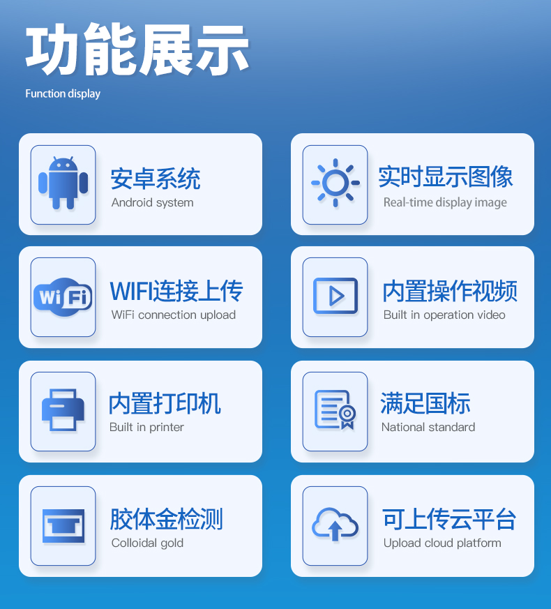 | 儀器采用10.1英寸液晶觸摸屏顯,搭配運(yùn)行安卓智能操作系統(tǒng),主控芯片采用ARM Cortex-A7,RK3288/4核處理器,主頻1.88Ghz,運(yùn)轉(zhuǎn)速度更快速,性能更強(qiáng)。 | 儀器功能包括:膠體金檢測(cè)模塊、數(shù)字化管理模塊、無(wú)線通訊模塊等,可以滿足同一軟件下實(shí)現(xiàn)所有檢測(cè)項(xiàng)目的檢測(cè),并在同一窗口展示檢測(cè)結(jié)果。 | 一體化便攜式快檢設(shè)備,采用交直流兩用供電方式,可連接車載電源,配備6ah大容量充電鋰電池,可以滿足現(xiàn)場(chǎng)及流動(dòng)檢測(cè)使用的需求。儀器尺寸:43×35×20cm, 主機(jī)凈重:5.1kg | 系統(tǒng)自帶數(shù)據(jù)集成模塊,設(shè)備首頁(yè)自動(dòng)統(tǒng)計(jì)檢測(cè)數(shù)據(jù)包含:周檢測(cè)數(shù)據(jù)、月檢測(cè)數(shù)據(jù),全部檢測(cè)總數(shù)量,均包含檢測(cè)總數(shù),合格數(shù),不合格數(shù),以及相關(guān)柱形分析圖,對(duì)各項(xiàng)檢測(cè)數(shù)據(jù)清晰掌握,無(wú)需電腦查詢,更加快捷直觀。 | 儀器具有任務(wù)預(yù)設(shè)模塊,可在樣品送檢前提前預(yù)設(shè)樣品名稱、檢測(cè)指標(biāo)、送檢單位等信息,樣品送檢時(shí)一鍵調(diào)取保存信息,檢測(cè)更加方便快捷。 | 膠體金檢測(cè)模塊:軌道式自動(dòng)傳輸掃描方式,可實(shí)時(shí)顯示金標(biāo)卡實(shí)時(shí)圖像,系統(tǒng)自動(dòng)分析并呈現(xiàn)出CT曲線圖,CT線自動(dòng)識(shí)別,無(wú)需手動(dòng)調(diào)整,完成檢測(cè)后自動(dòng)退出檢測(cè)卡。 結(jié)果判定線可修改,對(duì)照值標(biāo)定值可保存,斷電不丟失數(shù)據(jù)。 兼容市場(chǎng)上其他膠體金卡,使用耗材不受限制,極大增強(qiáng)用戶使用體驗(yàn)。 | 儀器檢測(cè)系統(tǒng)擁有龐大數(shù)據(jù)庫(kù),并且構(gòu)建了完善的檢索、修訂功能。食品庫(kù)涵蓋多種樣品名稱,可按需添加或刪除、編輯樣品名稱;產(chǎn)品數(shù)據(jù)庫(kù)以及歷史檢測(cè)記錄支持一鍵檢索功能。 | 系統(tǒng)打印自定義化,打印格式多樣化,產(chǎn)品合格證(國(guó)家標(biāo)準(zhǔn)要求),二維碼,抽樣信息、檢測(cè)信息,受檢信息、復(fù)核信息、抽樣日期、檢測(cè)日期等信息結(jié)果,可按需求自行設(shè)置打印內(nèi)容。 | A4紙版本報(bào)告打印功能(可選配):設(shè)備擁有兩種結(jié)果展示方式,可以自動(dòng)生成A4打印模板和小票打印模板兩種樣式,可通過(guò)WiFi及網(wǎng)線等方式鏈接外置打印機(jī)可進(jìn)行打印 | 儀器具有 wifi 聯(lián)網(wǎng)上傳、RJ45網(wǎng)線連接功能,可以快速上傳數(shù)據(jù)。同步對(duì)接監(jiān)管平臺(tái),數(shù)據(jù)可局域網(wǎng)和互聯(lián)網(wǎng)數(shù)據(jù)上傳,檢測(cè)結(jié)果直接傳至食品安全監(jiān)管平臺(tái)。進(jìn)行區(qū)域食品安全監(jiān)管及大數(shù)據(jù)分析處理與數(shù)據(jù)統(tǒng)計(jì),檢測(cè)區(qū)域食品安全長(zhǎng)短期動(dòng)態(tài),達(dá)到食品安全問(wèn)題預(yù)估、預(yù)警。 | 設(shè)備支持U盤(pán)存儲(chǔ),標(biāo)準(zhǔn)USB接口,免驅(qū)動(dòng)安裝。檢測(cè)結(jié)果存儲(chǔ)容量20萬(wàn)條以上,可生成Excel表格,進(jìn)行一鍵拷貝,并具有登錄保護(hù)功能,可設(shè)置用戶名及密碼,規(guī)范不同人員操作權(quán)限,防止非工作人員操作,并且可以進(jìn)行重新校準(zhǔn)、鎖定、恢復(fù)出廠設(shè)置功能。儀器固件可升級(jí),后期檢測(cè)項(xiàng)目可擴(kuò)充。 | 儀器具備遠(yuǎn)程升級(jí)功能,可定向分客戶分儀器更新,開(kāi)機(jī)后自動(dòng)更新,并可持續(xù)性免費(fèi)更新系統(tǒng)版本,無(wú)需像傳統(tǒng)產(chǎn)品返廠更新,節(jié)省時(shí)間及人力成本并避免了物流運(yùn)輸返廠升級(jí)導(dǎo)致設(shè)備損壞的潛在風(fēng)險(xiǎn)。 |