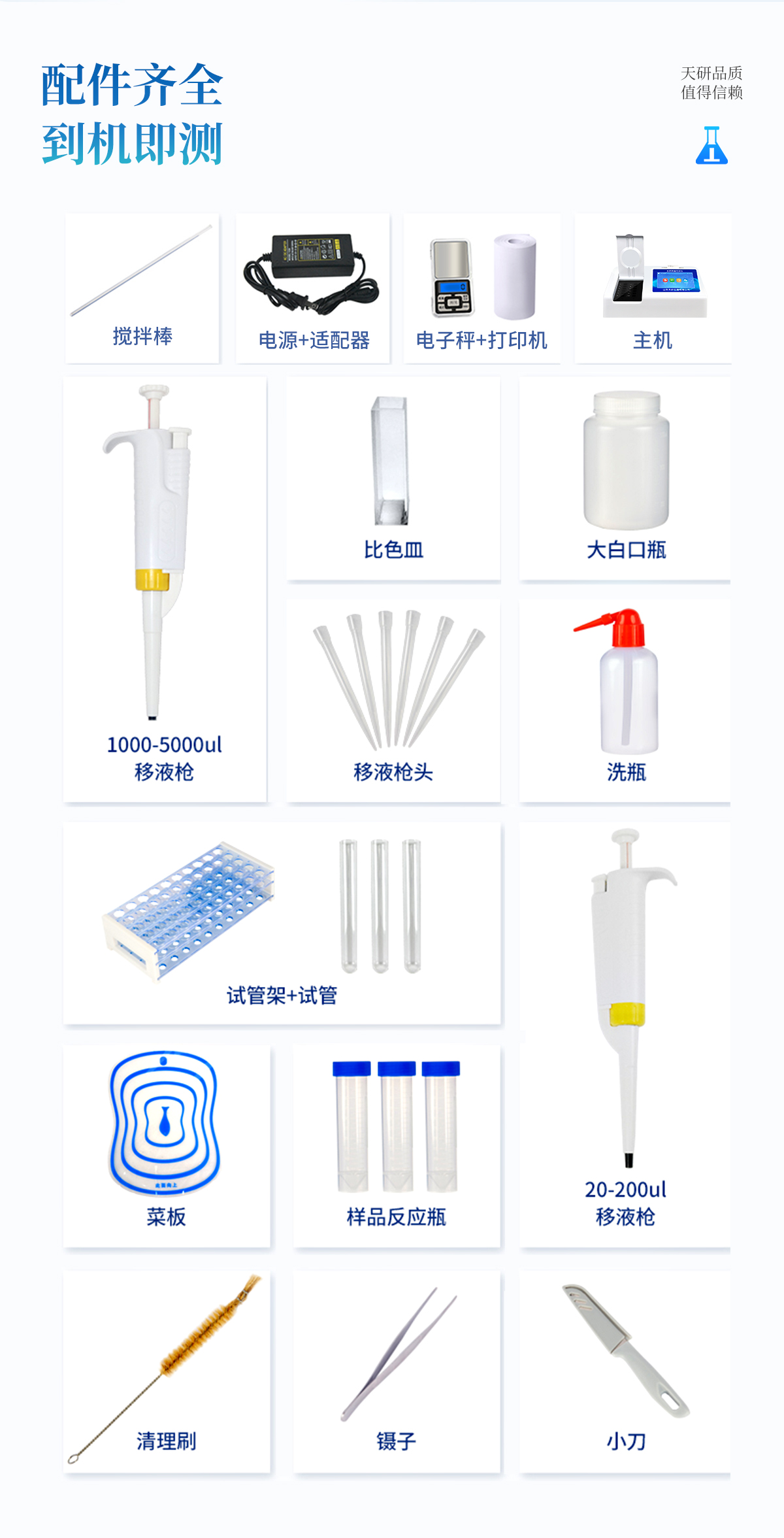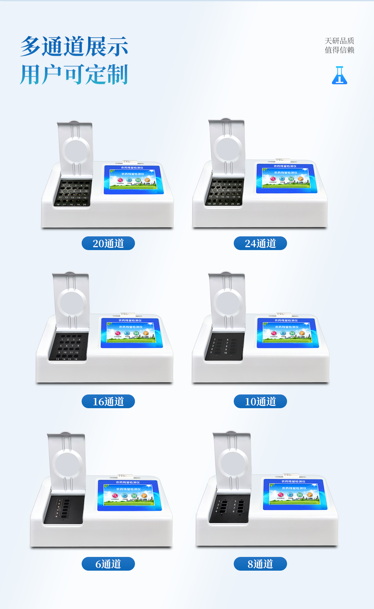 | 乙酰膽堿酯酶和丁酰膽堿酯酶試劑均可以使用,符合國家標準和農業(yè)部標準的要求。 | 自動判斷樣品是否合格,檢測結果更加直觀。 | 儀器具有100多種蔬菜名稱菜單庫,分類管理,并可按需添加或刪除蔬菜名,編輯蔬菜名稱,可直接打印出蔬菜名稱。 | 檢測通道:12個檢測通道,可以同時測試多個樣品,循環(huán)檢測,即放即檢,每個樣品由程序控制分別獨立工作,不會互相干擾。 | 智能操作系統(tǒng),采用更加人性化操作,主控采用多核處理器,主頻1.88Ghz,運轉速度更快速,穩(wěn)定性更強。 | 顯示方式:7英寸高靈敏真彩觸摸屏顯示,人性化中文操作界面,讀數(shù)直觀、簡單。 | 打印機采用串口5v打印,可選擇手動打印或者自動打印,三分鐘出打印結果,打印格式為檢測人姓名、吸光度差值、檢測時間、檢測機構、樣品名稱及結果判定。 | 光源采用進口超高亮發(fā)光二極管,具有低功耗、高精度、穩(wěn)定性強、光源可控可以關掉不使用的光源,響應速度快等優(yōu)點。 | 智能恒流穩(wěn)壓,光強自動校準,長時間連續(xù)工作光源無溫漂現(xiàn)象。 | 儀器具有GPRS遠傳功能,可插手機卡實現(xiàn)數(shù)據(jù)遠傳平臺,wifi聯(lián)網(wǎng)功能,可將數(shù)據(jù)快速上傳電腦,進行數(shù)據(jù)管理與統(tǒng)計。 | 采用USB2.0接口設計,方便數(shù)據(jù)的存貯和移動,并可隨時與計算機直接相連,并且可用計算機控制儀器。實現(xiàn)數(shù)據(jù)查詢、瀏覽、分析、統(tǒng)計、打印等。 | 智能化程度高,儀器具有自檢功能:具有開機自檢和調零功能,具有自動檢測重復性功能 | 儀器具有自身保護功能,可設置用戶名及密碼,防止非工作人員操作等。 | 采用DC12v直流供電,安全系統(tǒng)更高,并且配備6A鋰電池充電器。 | 儀器具有重新校準、鎖定、恢復出廠設置功能。 |