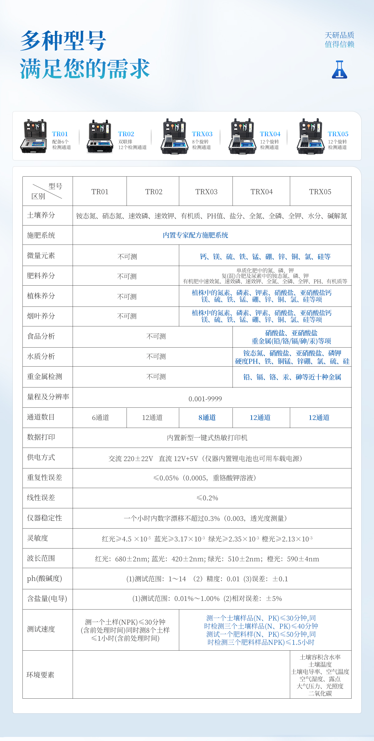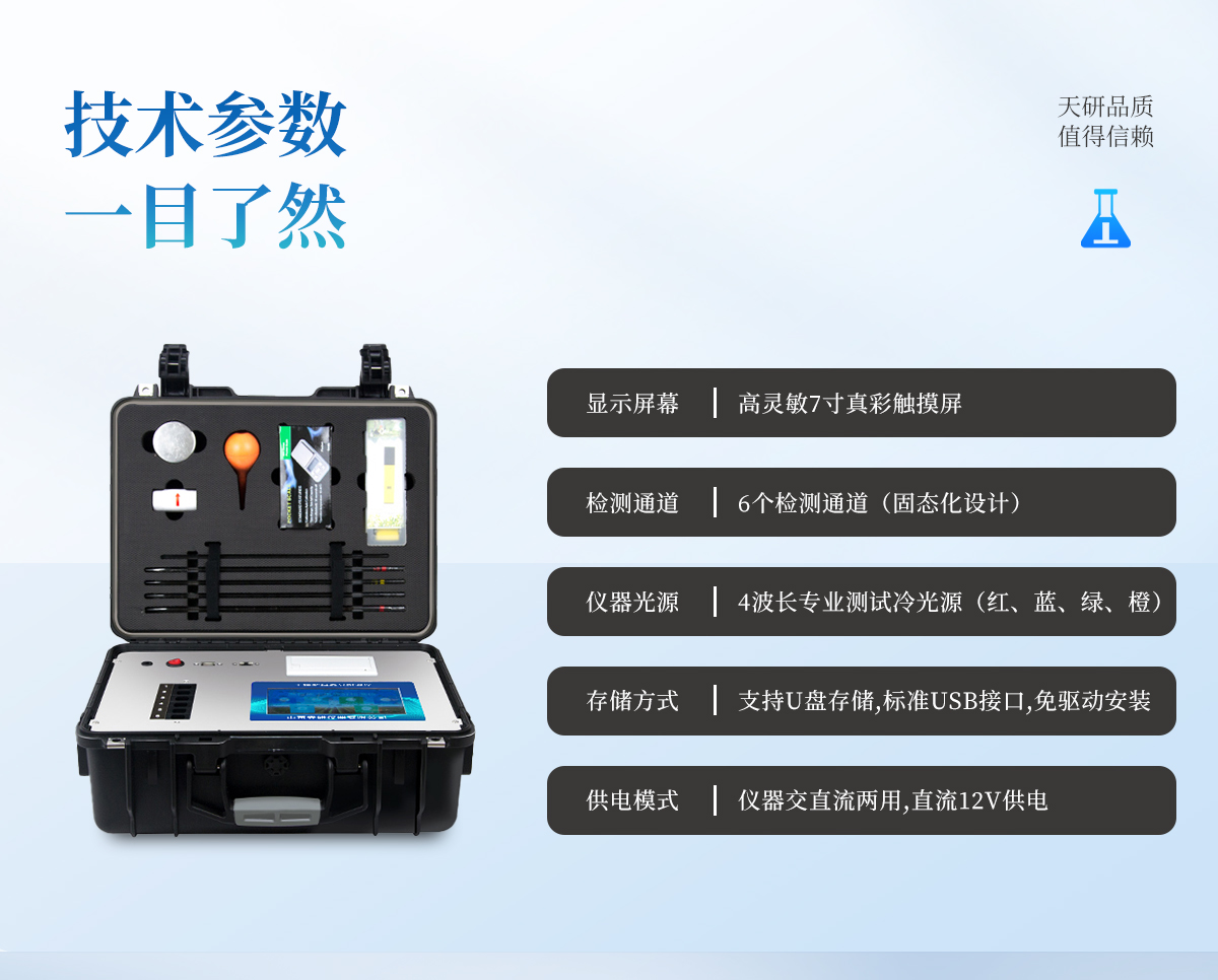 產(chǎn)品簡介:(新開發(fā),農(nóng)資經(jīng)銷商、農(nóng)技體系普及型)(新一代智能型,內(nèi)置測土配方施肥功能,圖譜診斷,二維碼打印,數(shù)據(jù)上傳,及測試用到的所有配件,保證用戶只需提供純凈水即可完成氮磷鉀有機質(zhì)pH含鹽量的準(zhǔn)確測定?。┢放疲禾煅? 型號:TY-TR01產(chǎn)品簡介:配套齊全:該儀器集藥、器、儀為一體,攜帶方便,相當(dāng)于一個