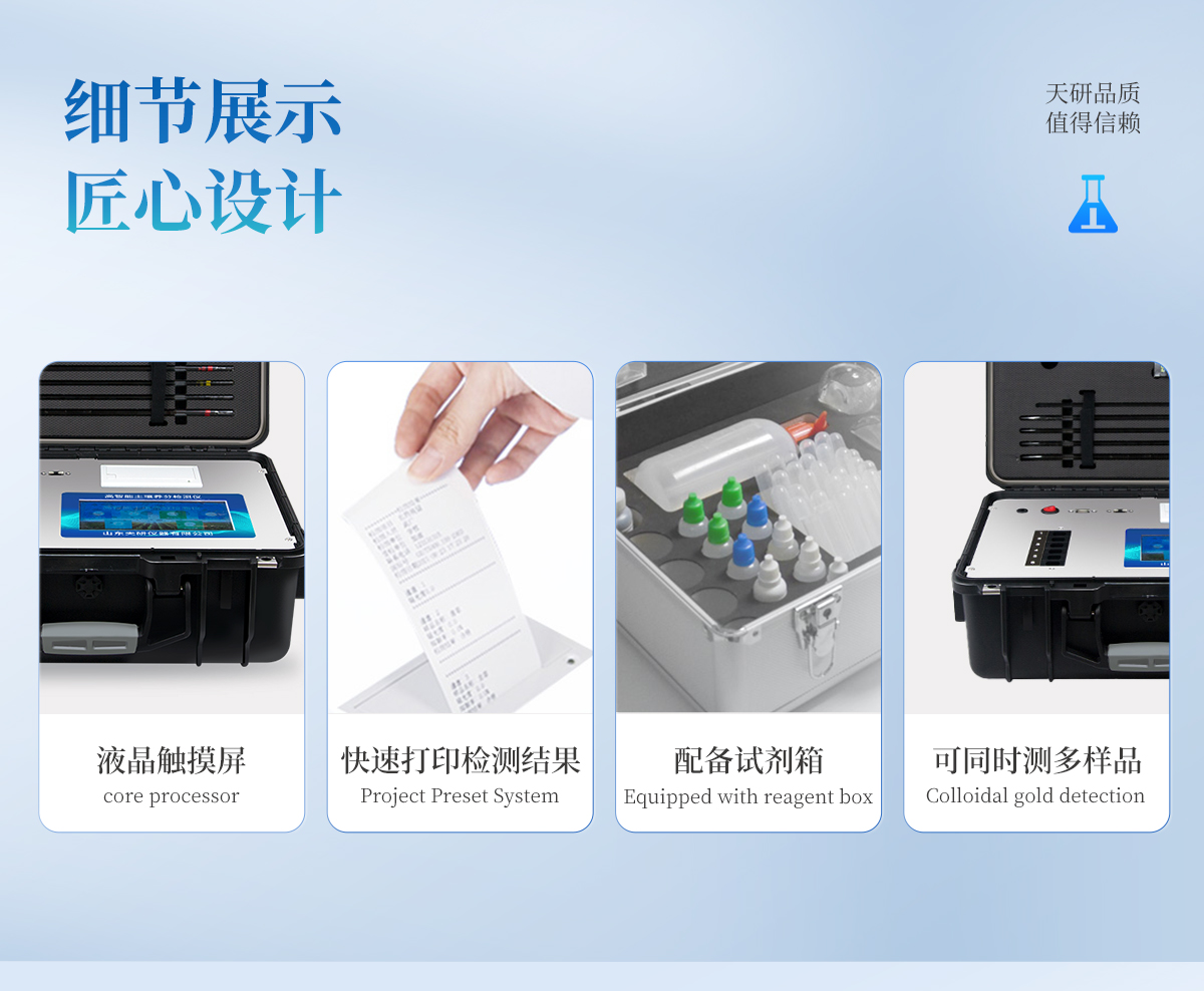 | 1、本儀器集各功能于一身,無需用戶自配附件,可靈活流動檢測。 | 2、安卓智能操作系統(tǒng),主控芯片采用ARM Cortex-A7,RK3288/4核處理器,主頻1.88Ghz,運轉(zhuǎn)速度更快速,穩(wěn)定性更強。 | 3、6個檢測通道(固態(tài)化設(shè)計),一次性可快速檢測6個樣品,極大提升檢測效率,降低檢測成本。 | 4、檢測過程中內(nèi)置校準(zhǔn)功能,智能恒流穩(wěn)壓,光強自動校準(zhǔn),確保檢測準(zhǔn)確度。 | 5、內(nèi)置作物專家施肥系統(tǒng),可對百余種全國農(nóng)業(yè)經(jīng)濟作物、果樹等的目標(biāo)產(chǎn)量計算推薦施肥量,依據(jù)施肥配方科學(xué)指導(dǎo)農(nóng)業(yè)生產(chǎn)。測土配方施肥結(jié)果可打印,打印內(nèi)容包含:作物種類、肥料種類、目標(biāo)產(chǎn)量、需求總量、建議施肥方案。 | 6、儀器標(biāo)配wifi無線上傳、4G聯(lián)網(wǎng)傳輸、GPRS無線遠傳功能,快速上傳數(shù)據(jù)。 | 7、儀器內(nèi)置大容量內(nèi)存,支持查看全部歷史檢測記錄,以及傳輸所有檢測數(shù)據(jù)。 | 8、配有智慧云農(nóng)業(yè)平臺,儀器連入無線網(wǎng)絡(luò)后,可將檢測數(shù)據(jù)可選擇性或批量無線上傳,方便用戶進行長期數(shù)據(jù)管理和可視化分析 | 9、儀器同時具有USB接口、以太網(wǎng)接口,并可隨時用U盤拷貝出數(shù)據(jù)。 | 10、可用手機隨時登錄云平臺在線移動查看歷史數(shù)據(jù) | 11、內(nèi)置植物營養(yǎng)診斷標(biāo)準(zhǔn)圖譜,根據(jù)各農(nóng)作物營養(yǎng)缺失的圖片,進行葉面對比,診斷豐缺。 | 12、4波長專業(yè)測試?yán)涔庠矗t、藍、綠、橙),光源波長穩(wěn)定,長時間連續(xù)工作光源無溫漂現(xiàn)象,壽命長達10萬小時級別,重現(xiàn)性好,準(zhǔn)確度高。 | 13、比色池部分采用標(biāo)準(zhǔn)1cm比色皿,無機械位移及磨損,光路測試定位**,有效屏蔽外光干擾,保證檢測結(jié)果優(yōu)于國標(biāo)要求。 | 14、儀器系統(tǒng)內(nèi)帶有樣品前處理操作視頻,各種樣品檢測方法點擊視頻模塊即可觀看,檢測人員無需自學(xué)說明書,指導(dǎo)教學(xué)方便快速,方便新手快速操作。 | 15、內(nèi)置新一代高速熱敏打印機(無需色帶),打印內(nèi)容包含:檢測單位、檢測人員、檢測項目、通道號、吸光度、養(yǎng)分含量(mg/kg)、檢測時間、以及二維碼等信息 | 16、高靈敏7寸真彩觸摸屏,采用更加**和人性化操作,高清晰高交互顯示,大程度降低傳統(tǒng)儀器的繁瑣操作和失誤。 | 17、內(nèi)置時鐘功能,方便操作時間記錄,長期歷史追溯。 | 18、可設(shè)置多賬戶賬號密碼登錄,**UI交互界面,不同的用戶可自由添加編輯檢測信息,保存后可長期使用。 | 19、GPS功能:可在野外作業(yè)時記錄經(jīng)緯度地點,滿足特殊用戶需求。 | 20、內(nèi)置低電壓提示功能,可在檢測時明確電量,避免測試數(shù)據(jù)偏移,同時具有斷電保護功能,斷電自動保存數(shù)據(jù),防止數(shù)據(jù)丟失。 | 21、交直流兩用供電方式,內(nèi)置大容量充電鋰電池,滿電狀態(tài)下可連續(xù)工作10余小時,同時可外接車載電源蓄電。 | 22、儀器具有中英文切換功能,可滿足出口要求。 | 23、高強度PVC工程塑料手提箱設(shè)計,堅固耐用,便于攜帶。 |