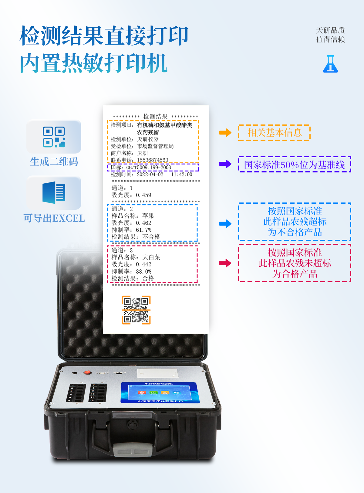 | 隨著人民生活水平的不斷提升,市場對茶葉的把控愈加嚴(yán)格。針對現(xiàn)狀,我司專門研發(fā)生產(chǎn)--茶葉專用的農(nóng)藥殘留速測儀;定位茶農(nóng)、茶商、茶葉企業(yè)使用。 此外還可用于果蔬茶生產(chǎn)基地和農(nóng)貿(mào)批發(fā)銷售市場現(xiàn)場檢測,餐館、學(xué)校、食堂、家庭果蔬加工前的安全速測等。 | 檢測通道: 6個檢測通道,可以同時測試多個樣品,每個樣品由程序控制分別獨立工作,不會互相干擾。 | 顯示方式:≥5英寸液晶觸摸屏顯示,人性化中文操作界面,讀數(shù)直觀、簡單。 | 配備嵌入式高速熱敏打印機(jī),可選擇手動打印或者自動打印,三分鐘出打印結(jié)果。 | 光源采用進(jìn)口超高亮發(fā)光二極管,具有低功耗、穩(wěn)定性強、高靈敏度,高檢測精度,高重復(fù)性精度,光源可控、響應(yīng)速度快等優(yōu)點。 | 采用標(biāo)準(zhǔn)USB接口設(shè)計,免驅(qū)動安裝,方便數(shù)據(jù)的存貯和移動,并可隨時與計算機(jī)直接相連,并且可用計算機(jī)控制儀器。實現(xiàn)數(shù)據(jù)查詢、瀏覽、分析、統(tǒng)計、打印等。 | 智能化程度高,儀器具有自檢功能:具有開機(jī)自檢和調(diào)零功能,具有自動檢測重復(fù)性功能 | 內(nèi)置強大的數(shù)據(jù)庫,可在儀器上直接選擇樣品名稱、檢測指標(biāo)、送檢單位等信息,也可在儀器上直接編輯錄入樣品名稱、檢測指標(biāo)、送檢單位等信息并保存進(jìn)樣品數(shù)據(jù)庫。 | 支持Wifi網(wǎng)絡(luò),數(shù)據(jù)可局域網(wǎng)和互聯(lián)網(wǎng)數(shù)據(jù)上傳,檢測結(jié)果直接傳至食品安全監(jiān)管平臺。進(jìn)行區(qū)域食品安全監(jiān)管及大數(shù)據(jù)分析處理,檢測區(qū)域食品安全長短期動態(tài),達(dá)到食品安全問題預(yù)估、預(yù)警 |