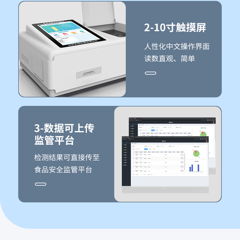 | 儀器采用臺(tái)式一體化系統(tǒng)檢測(cè)技術(shù),將分光光度模塊、新型農(nóng)殘檢測(cè)模塊、數(shù)字化管理模塊、無(wú)線通訊模塊高度集成于一體,支持檢測(cè)200種食品安全檢測(cè)項(xiàng)目,同時(shí)預(yù)留升級(jí)檢測(cè)方法。 | 儀器檢測(cè)模塊標(biāo)準(zhǔn)化、智能化,可隨意自由組合。檢測(cè)箱體內(nèi)置多個(gè)標(biāo)準(zhǔn)檢測(cè)單元,檢測(cè)模塊可以調(diào)整配置。 | 儀器采用全新安卓智能系統(tǒng),主控芯片采用 ARM Cortex-A7,RK3288/4核處理器,10.1寸高清液晶觸摸豎屏,更加**的UI交互界面,運(yùn)轉(zhuǎn)快捷;儀器配備無(wú)線通信模塊: 4G(APN)通訊模塊、Wifi模塊,藍(lán)牙傳輸,同時(shí)具有雙USB接口以及RJ45接口能以多種方式實(shí)現(xiàn)數(shù)據(jù)保存和數(shù)據(jù)傳輸功能。 | 創(chuàng)新檢測(cè)模式: | ★檢測(cè)通道:≥12通道;采用精密旋轉(zhuǎn)比色池設(shè)計(jì),使用同芯片同光源校準(zhǔn)精度,解決不同光源之間的誤差值。1-12通道間誤差0.1%。(**號(hào):ZL202022821055.2) | ★儀器具有自動(dòng)識(shí)別比色皿檢測(cè)功能,即:將樣品比色皿放入儀器后,點(diǎn)擊樣品檢測(cè),儀器自動(dòng)識(shí)別比色皿進(jìn)行通道檢測(cè)。 | 進(jìn)口高精光源: | 高精度進(jìn)口四波長(zhǎng)冷光源,通道配置 410、520、590、630nm 波長(zhǎng)光源,一個(gè)光源芯片驅(qū)動(dòng)一個(gè)光源,誤差極小,每臺(tái)設(shè)備單獨(dú)**校準(zhǔn)光源,**比對(duì),同時(shí)參照四種不同波段光源全方位覆蓋市面上99%的農(nóng)殘食品項(xiàng)目檢測(cè)。 | 智能化操作系統(tǒng): | 便捷操作系統(tǒng):設(shè)備檢測(cè)時(shí)可在同一檢測(cè)界面自動(dòng)對(duì)應(yīng)相關(guān)檢測(cè)通道一次性選擇1-12個(gè)樣品名稱,無(wú)須退出界面,節(jié)省操作時(shí)間。 | 數(shù)據(jù)集成系統(tǒng):設(shè)備首頁(yè)自動(dòng)統(tǒng)計(jì)檢測(cè)數(shù)據(jù)包含:周檢測(cè)數(shù)據(jù)、月檢測(cè)數(shù)據(jù),全部檢測(cè)總數(shù)量,均包含檢測(cè)總數(shù),合格數(shù),不合格數(shù),以及相關(guān)柱形分析圖,對(duì)各項(xiàng)檢測(cè)數(shù)據(jù)清晰掌握,無(wú)需電腦查詢,更加快捷直觀。 | 項(xiàng)目預(yù)設(shè)系統(tǒng):支持添加單個(gè)及多個(gè)相同或不相同的任務(wù)預(yù)設(shè),一鍵快速調(diào)取,每一個(gè)任務(wù)分別可以設(shè)置不同的樣品、批次、編號(hào)、來(lái)源、備注、抽樣信息、檢測(cè)信息、受檢信息、復(fù)核信息等更多信息。無(wú)縫鏈接平臺(tái)和APP實(shí)時(shí)查看下發(fā)任務(wù)。 | 數(shù)據(jù)監(jiān)管系統(tǒng):同步對(duì)接監(jiān)管平臺(tái),數(shù)據(jù)可局域網(wǎng)和互聯(lián)網(wǎng)數(shù)據(jù)上傳,檢測(cè)結(jié)果可選擇直接傳至食品安全監(jiān)管平臺(tái)。集成OSS輸出存儲(chǔ)服務(wù)、區(qū)分設(shè)備定向管理應(yīng)用,進(jìn)行區(qū)域食品安全監(jiān)管及大數(shù)據(jù)分析處理與數(shù)據(jù)統(tǒng)計(jì),檢測(cè)區(qū)域食品安全長(zhǎng)短期動(dòng)態(tài),達(dá)到食品安全問(wèn)題預(yù)估、預(yù)警。 | 自定義打印系統(tǒng):內(nèi)置全新打印系統(tǒng),新創(chuàng)自定義打印方式,可按需靈活設(shè)置開(kāi)啟或關(guān)閉:產(chǎn)品合格證(國(guó)家農(nóng)業(yè)部標(biāo)準(zhǔn)要求),二維碼,抽樣信息、檢測(cè)信息,受檢信息、復(fù)核信息、抽樣日期、檢測(cè)日期等信息的打印。 | 系統(tǒng)遠(yuǎn)程更新功能:可定向分客戶分儀器更新系統(tǒng),按照不同客戶后期實(shí)際需求添加項(xiàng)目,無(wú)需機(jī)器返廠,即可遠(yuǎn)程實(shí)時(shí)升級(jí)全新系統(tǒng),節(jié)省時(shí)間成本及避免運(yùn)輸造成設(shè)備損壞。 | 儀器主機(jī)采用一體化防水、抗壓、防撞擊、防腐蝕箱體設(shè)計(jì),同時(shí)配備交直流供電,可連接車載電源,可選配大容量充電鋰電池,滿足現(xiàn)場(chǎng)野外檢測(cè)需求。 | 安全證書,放心保障:儀器具有中國(guó)計(jì)量科學(xué)研究院校準(zhǔn)證書,**認(rèn)證。 |