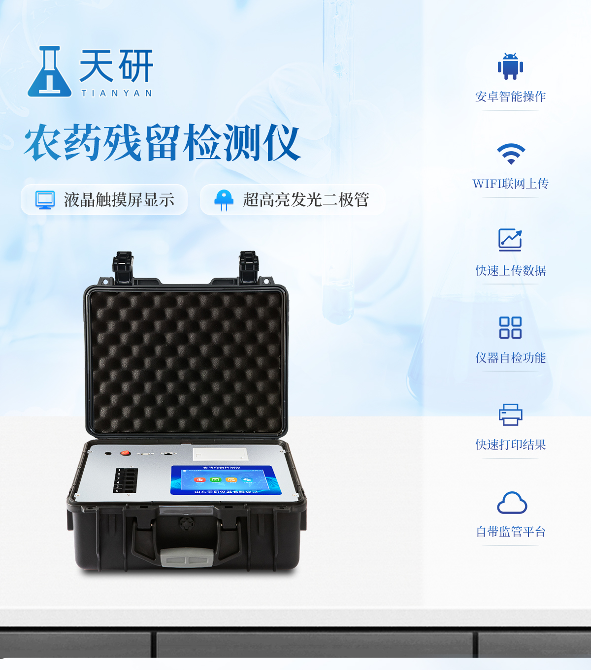 | 隨著人民生活水平的不斷提升,市場對茶葉的把控愈加嚴(yán)格。針對現(xiàn)狀,我司專門研發(fā)生產(chǎn)--茶葉專用的農(nóng)藥殘留速測儀;定位茶農(nóng)、茶商、茶葉企業(yè)使用。 此外還可用于果蔬茶生產(chǎn)基地和農(nóng)貿(mào)批發(fā)銷售市場現(xiàn)場檢測,餐館、學(xué)校、食堂、家庭果蔬加工前的安全速測等。 | 檢測通道: 5個(gè)檢測通道,可以同時(shí)測試多個(gè)樣品,每個(gè)樣品由程序控制分別獨(dú)立工作,不會(huì)互相干擾。 | 顯示方式:≥5英寸液晶觸摸屏顯示,人性化中文操作界面,讀數(shù)直觀、簡單。 | 配備嵌入式高速熱敏打印機(jī),可選擇手動(dòng)打印或者自動(dòng)打印,三分鐘出打印結(jié)果。 | 光源采用進(jìn)口超高亮發(fā)光二極管,具有低功耗、穩(wěn)定性強(qiáng)、高靈敏度,高檢測精度,高重復(fù)性精度,光源可控、響應(yīng)速度快等優(yōu)點(diǎn)。 | 采用標(biāo)準(zhǔn)USB接口設(shè)計(jì),免驅(qū)動(dòng)安裝,方便數(shù)據(jù)的存貯和移動(dòng),并可隨時(shí)與計(jì)算機(jī)直接相連,并且可用計(jì)算機(jī)控制儀器。實(shí)現(xiàn)數(shù)據(jù)查詢、瀏覽、分析、統(tǒng)計(jì)、打印等。 | 智能化程度高,儀器具有自檢功能:具有開機(jī)自檢和調(diào)零功能,具有自動(dòng)檢測重復(fù)性功能 | 內(nèi)置強(qiáng)大的數(shù)據(jù)庫,可在儀器上直接選擇樣品名稱、檢測指標(biāo)、送檢單位等信息,也可在儀器上直接編輯錄入樣品名稱、檢測指標(biāo)、送檢單位等信息并保存進(jìn)樣品數(shù)據(jù)庫。 | 支持Wifi網(wǎng)絡(luò),數(shù)據(jù)可局域網(wǎng)和互聯(lián)網(wǎng)數(shù)據(jù)上傳,檢測結(jié)果直接傳至食品安全監(jiān)管平臺(tái)。進(jìn)行區(qū)域食品安全監(jiān)管及大數(shù)據(jù)分析處理,檢測區(qū)域食品安全長短期動(dòng)態(tài),達(dá)到食品安全問題預(yù)估、預(yù)警 |