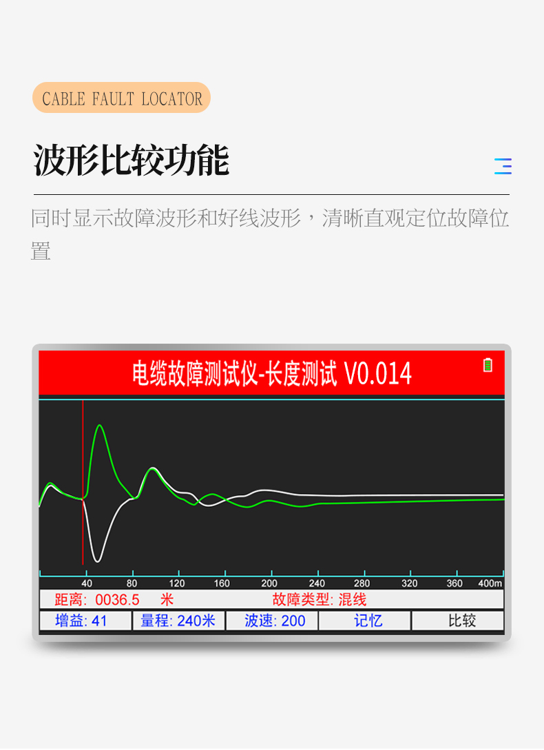 | 1.480*800大屏幕真彩手機(jī)細(xì)膩屏在陽(yáng)光下也能清晰可辨。 | 2.自帶數(shù)據(jù)接口,支持客戶(hù)遠(yuǎn)程升級(jí)。 | 3.采用ARM CPU配合FPGA技術(shù),可快速準(zhǔn)確判斷故障波形。 | 4.波形比較功能,特別適用于線(xiàn)路某點(diǎn)氧化造成后端電壓 | 低故障的測(cè)試定位。 | 5.簡(jiǎn)潔的對(duì)應(yīng)功能按鍵易學(xué)易會(huì)直觀方便。 | 6.高能量鋰電池,使用時(shí)間可達(dá)6-8小時(shí)。 | 7.信號(hào)器自帶萬(wàn)用表功能方便測(cè)試電壓電阻及絕緣。 |