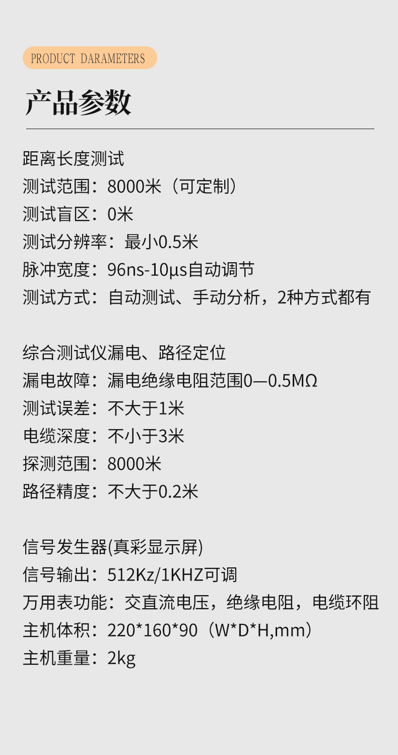 | 綜合測(cè)試儀距離長(zhǎng)度測(cè)試: | 測(cè)試范圍: 8000米(可定制) | 測(cè)試盲區(qū): 0米 | 測(cè)試分辨率:*小0.5米 | 脈沖寬度: 96ns-10μs自動(dòng)調(diào)節(jié) | 測(cè)試方式:自動(dòng)測(cè)試、手動(dòng)分析,2種方式都有 | 綜合測(cè)試儀漏電、路徑定位: | 漏電故障:漏電絕緣電阻范圍0-0.5MΩ | 測(cè)試誤差:不大于1米 | 電纜深度:不小于3米 | 探測(cè)范圍: 8000米 | 路徑精度:不大于0.2米. | 信號(hào)發(fā)生器(真彩顯示屏) : | 信號(hào)輸出:1KHZ可調(diào) | 萬(wàn)用表功能:交直流電壓、絕緣電阻、電纜環(huán)阻 | 主機(jī)體積: 220*1 60*90 (W*D*H, mm) | 主機(jī)重量: 2kg |