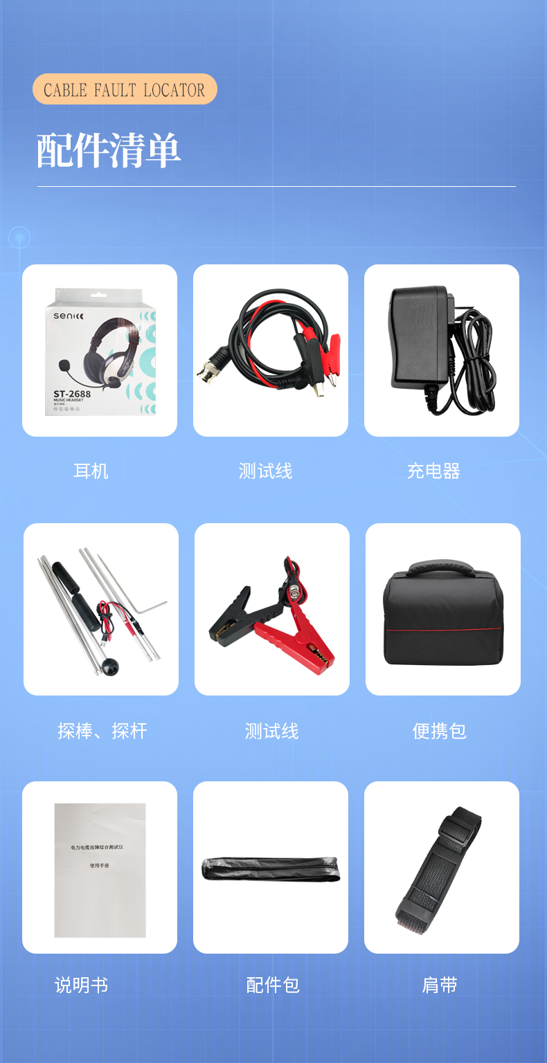 | 測(cè)試儀主機(jī)........... 1臺(tái) | 信號(hào)發(fā)生器........... 1臺(tái) | 測(cè)試耳機(jī).............. 1個(gè) | 專(zhuān)用充電器........... 2個(gè) | 路徑探頭...............1付 | 漏電探桿.............. 1付 | 長(zhǎng)度測(cè)試線(xiàn)(信號(hào)器連接線(xiàn)..與長(zhǎng)度測(cè)試通用)......1條 | 接地釬.................. 1個(gè) | 儀器包.................. 2個(gè) | 說(shuō)明書(shū).................. 1個(gè) | 合格證保修卡.........1組 |
