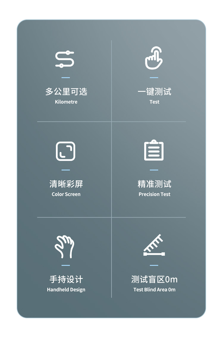 | 手動測試**測量范圍 8Km | 智能測試**測量范圍 4Km | **分辨率 0.5m | 測試盲區(qū) 0m | 功耗 1W | 質(zhì)量 0.38KG | 體積 190×84×52mm3 | 使用環(huán)境溫度 -15℃ ~ +45℃ | 儲存溫度 -20℃ ~ +55℃ |