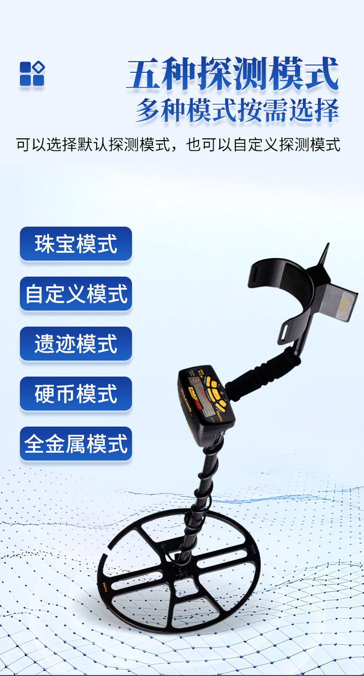 | ●探測盤:全新配置一款15存“DD”防水探測盤,可以擴大該儀器的探測范圍 | ●識別能力:可以單項區(qū)分金,銀,銅,鐵等 | ●聲音識別能力:金、銀、銅、鐵的報警聲音可以完全區(qū)分 | ●高靈敏度:提高了更強的探測靈敏度,增加機器的探測深度 | ●耳機:配置一個原廠配置的高清耳機 | ●定位: 可以快速的定位地下金屬的準確位置 | ●接收/拒絕:通過識別按鈕可以進行單項選擇探測,例如:選擇黃金,該儀器只對黃金進行報警 | ●硬幣深度顯示:在主機的右側(cè)有個顯示小金屬的深度 | ●電量狀況顯示: 可以顯示電源現(xiàn)有的電量 | ●定位按鈕: 可以精準定位金屬的位置 | ●五種探測模式: 可以選擇默認探測模式,也可以自定義探測模式 | 珠寶模式(可以刪除鐵,找到細小的金屬,比如戒指,耳環(huán),項鏈等) | 自定義模式(可以單項選擇性探測,選擇自己想要探測的金屬類型) | 遺跡模式(可以將鐵刪除,只探測有色金屬提高地下金屬探測效率) | 硬幣模式(這種識別模式的目的是排除酸性垃圾,許多拉環(huán)和標簽紙檢) | 全金屬模式(可以探測所有的金屬、金、銀、銅、鐵等) |