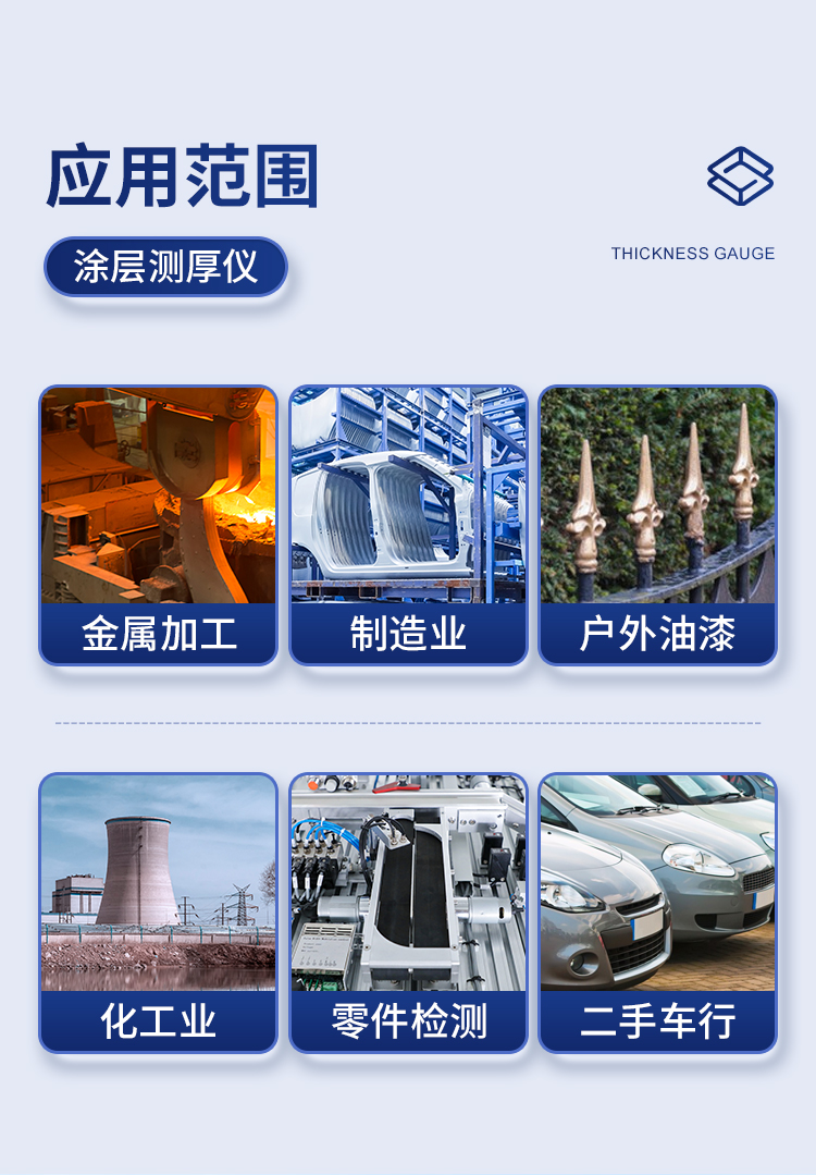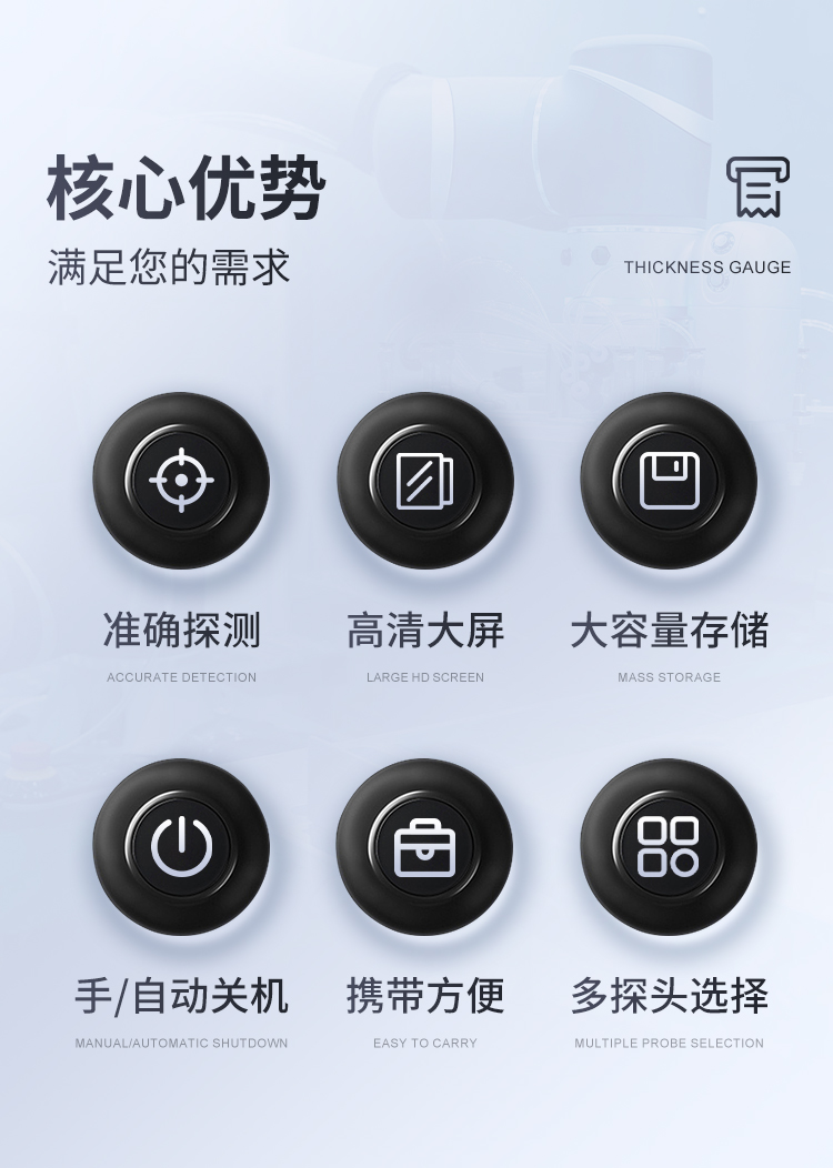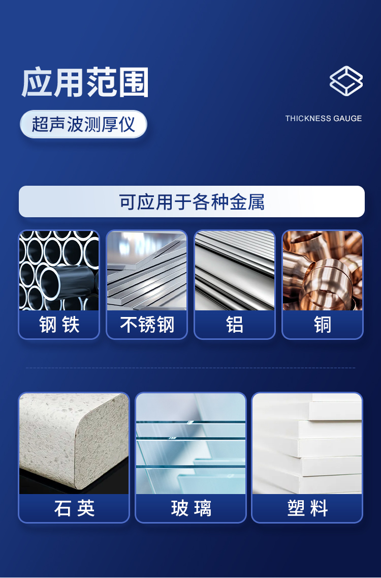 適用于各種材料的高精度厚度測量需求,可應用于各種金屬(鋼鐵、不銹鋼、鋁、銅、等)石英、玻璃、塑料等材質(zhì)的被測物體厚度測量。 只需要將探頭放置于被測物體一側(cè)的接觸面上,既可以迅速準確測量出被測物體厚度。