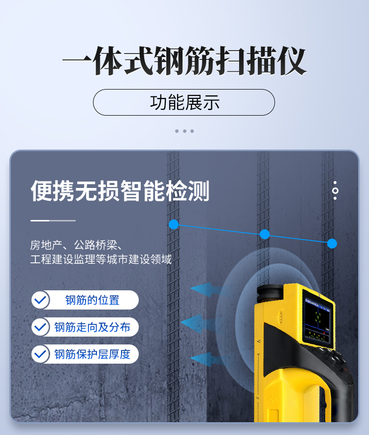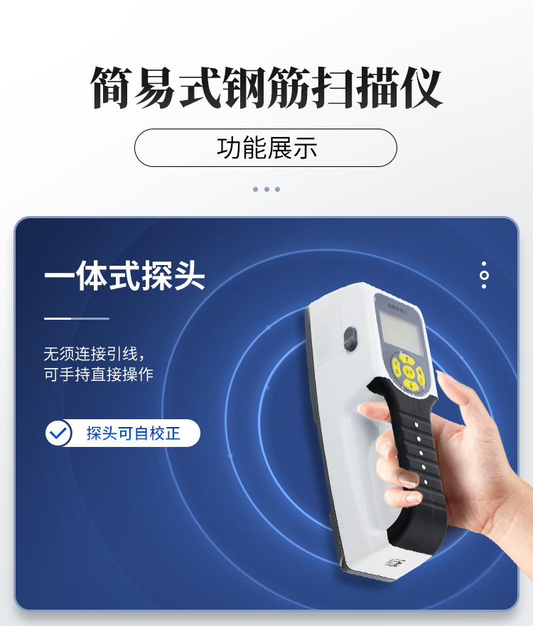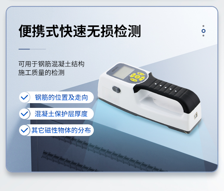 該機為內(nèi)置一體式探頭,無須連接引線,可手持直接操作是一種便攜式無損鋼筋保護層厚度檢測儀器??捎糜阡摻罨炷两Y(jié)構(gòu)施工質(zhì)量的檢測。能夠在混凝土表面確定鋼筋的位置、布筋情況,測量混凝土保護層厚度,此外也可對混凝土結(jié)構(gòu)中的磁性體及導(dǎo)電體的位置進行檢測,如墻體內(nèi)的電纜、水暖管道等,施工前的探測可以有效避免施工中對這些設(shè)施的損壞,減少意外的發(fā)生。 依據(jù)標準產(chǎn)品符合《混凝土結(jié)構(gòu)工程施工質(zhì)量驗收規(guī)范》 GB 50204-2002 對鋼筋檢測儀的要求。