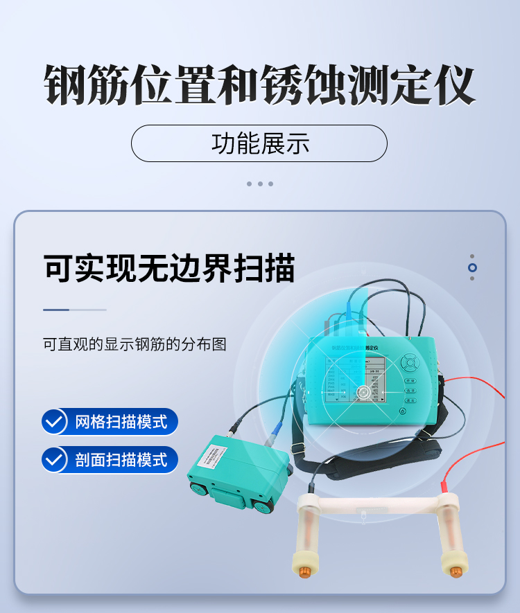 | 檢測混凝土結(jié)構(gòu)中鋼筋的位置及走向 | 檢測鋼筋的保護層厚度 | 探明結(jié)構(gòu)中其它磁性物體的分布 | 探頭自校正功能 |