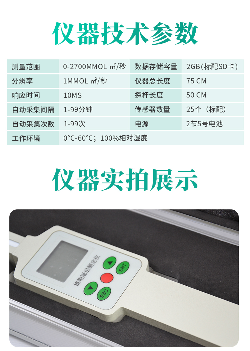 整套是由數(shù)據(jù)采集器和探桿兩部分組成。探桿上包括18個(gè)獨(dú)立的傳感器,可同時(shí)測(cè)量上、下冠層的PAR值。探桿長度:50 cm