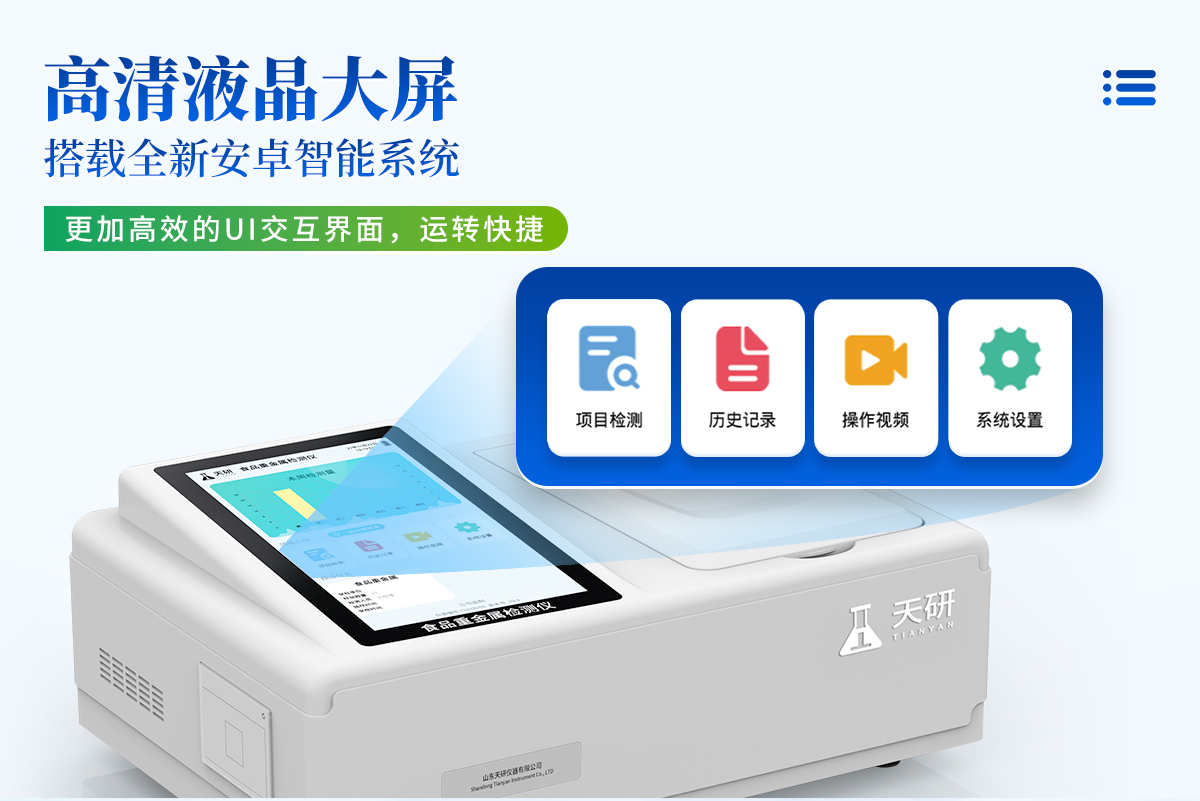 | 儀器采用臺式一體化系統(tǒng)檢測技術,將分光光度模塊、數(shù)字化管理模塊、無線通訊模塊高度集成于一體,同時預留升級檢測方法 | 儀器檢測模塊標準化、智能化,檢測項目可隨意自由組合。檢測箱體內置多個標準檢測單元,檢測模塊可以調整配置。 | 顯示屏幕:儀器采用7英寸液晶觸摸屏,搭配運行安卓智能操作系統(tǒng),主控芯片采用ARM Cortex-A7,RK3288/4核處理器,主頻1.88Ghz,操作方便,性能更強。 | 檢測通道:12通道;采用精密旋轉比色池設計,使用同芯片同光源校準精度,解決不同光源之間的誤差值,更加準確**。 | 儀器光源:高精度進口四波長冷光源,每個通道均配置 410、520、590、630nm 波長光源,標配**的光路切換裝置,光路切換功能可實現(xiàn)64波長,并且所有檢測項目可實現(xiàn)所有通道同時檢測。 | 通訊接口:配備無線通信模塊、可選配4G(APN)通訊模塊和藍牙傳輸,同時具有USB接口,可以多方式實現(xiàn)數(shù)據保存及數(shù)據傳輸。 | 存儲方式:支持U盤存儲,標準USB接口,免驅動安裝。檢測結果存儲容量20萬條以上,可生成Excel表格進行拷貝,并具有登錄保護功能。 | 智能化操作系統(tǒng): | 操作系統(tǒng):儀器可在同一檢測界面自動對應相關檢測通道,一次性選擇1-12個樣品名稱,無需退出界面,節(jié)省操作時間。并可以對每個通道屬性和樣品信息單獨進行編輯,例如送檢單位、人員,檢測人員等,打印時勾選打印顯示。 | 限量規(guī)判系統(tǒng):具有限量查詢、添加物質合規(guī)判定系統(tǒng)。檢測出結果后,系統(tǒng)自動調用系統(tǒng)數(shù)據庫中相關國標進行比對判定,客觀顯示結果是否合格。 | 數(shù)據監(jiān)管系統(tǒng):同步對接監(jiān)管平臺,數(shù)據可局域網和互聯(lián)網數(shù)據上傳,檢測結果可選擇直接傳至食品安全監(jiān)管平臺。進行區(qū)域食品安全監(jiān)管及大數(shù)據分析處理與數(shù)據統(tǒng)計,檢測區(qū)域食品安全長短期動態(tài),達到食品安全問題預估、預警。 | 供電模式:儀器交直流兩用,直流12V供電(標配),可連接車載電源,亦可選配6ah大容量充電鋰電池,電量可實時顯示,方便戶外流動測試。 | 儀器具有重新校準、鎖定、恢復出廠設置功能 |