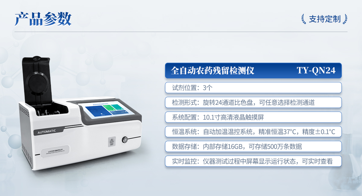 | 1. 試劑位置:3個 | 2. 檢測形式:旋轉(zhuǎn)24通道比色盤,可任意選擇檢測通道,自動對應(yīng)選擇通道。 | 3. 系統(tǒng)配置:10.1寸高清液晶觸摸屏,采用ARM Cortex?-A7,RK3288/4核處理器,運行內(nèi)存1GB。Android7.1.1 系統(tǒng)分辨率1280×800。 | 4.恒溫系統(tǒng):具有自動加溫溫控系統(tǒng),精準恒溫37℃,精度±0.1℃。 | 5.添加系統(tǒng):儀器按照試劑要求自動、按時、按量加入試劑,并且自動對未正常放置的樣本或異常的樣本進行檢查并提示。 | 6.清洗功能:儀器具備回流及自動清洗管路功能,避免試劑污染。 | 7.混勻功能:設(shè)備具備自動混勻功能。 | 8.光源校準:設(shè)備可自動校準,確保檢測準確度。 | 9.實時監(jiān)控:儀器測試過程中屏幕顯示運行狀態(tài),可實時查看。 | 10.數(shù)據(jù)存儲:內(nèi)部存儲16GB,可存儲500萬條數(shù)據(jù)。 | 11.樣品多選功能:設(shè)備具備樣品一鍵多選功能,選擇樣品自動匹配檢測通道。 | 12.項目預(yù)設(shè):可提前設(shè)置單個及多個相同或不相同的檢測任務(wù),可單次或者多次調(diào)取,減少檢測時間。 | 13.自定義打印系統(tǒng):內(nèi)置自定義打印系統(tǒng),可按需靈活設(shè)置開啟或關(guān)閉:產(chǎn)品合格證(國家農(nóng)業(yè)部標準),二維碼,抽樣信息、檢測信息,受檢信息等信息的打印。 | 14.A4版本報告打印功能:設(shè)備可自動生成A4版報告,A4報告帶二維碼,可掃描二維碼生成電子版,并可識別真?zhèn)巍?/td> | 15.傳輸方式:儀器配備無線通信模塊: 4G(APN)通訊模塊、Wifi模塊,藍牙傳輸模塊,同時具有USB接口以及RJ45接口能以多種方式實現(xiàn)數(shù)據(jù)保存和數(shù)據(jù)傳輸功能,設(shè)備數(shù)據(jù)可以同步上傳至平臺。 | 16.數(shù)據(jù)監(jiān)管系統(tǒng):設(shè)備自帶監(jiān)管平臺,并可同步對接監(jiān)管平臺,數(shù)據(jù)可局域網(wǎng)和互聯(lián)網(wǎng)數(shù)據(jù)上傳,檢測結(jié)果可直接傳至食品安全監(jiān)管平臺。達到食品安全問題預(yù)估、預(yù)警。 | 17.系統(tǒng)遠程更新功能:無需設(shè)備返廠,即可遠程實時升級全新系統(tǒng),節(jié)省時間成本及避免運輸造成設(shè)備損。 |