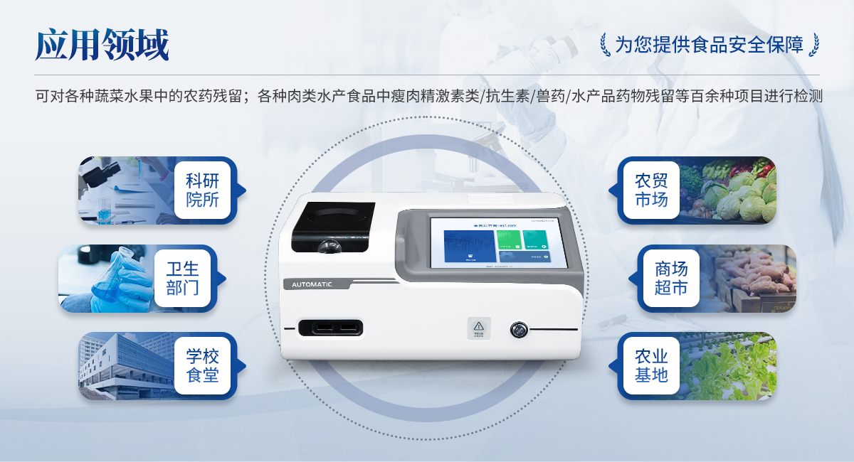 全自動農獸藥殘留檢測儀可對各種蔬菜水果中有機磷和氨基甲酸酯類農藥殘留;各種肉類水產食品中瘦肉精激素類殘留,抗生素殘留,獸藥殘留,水產品藥物殘留等百余種項目進行快速檢測。該設備廣泛應用于蔬菜批發(fā)市場、超市、商場、食藥監(jiān)等部門的蔬菜和水果中的農藥殘留檢測。