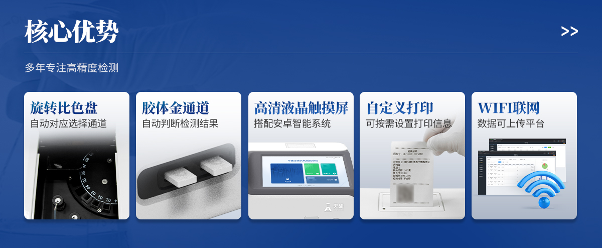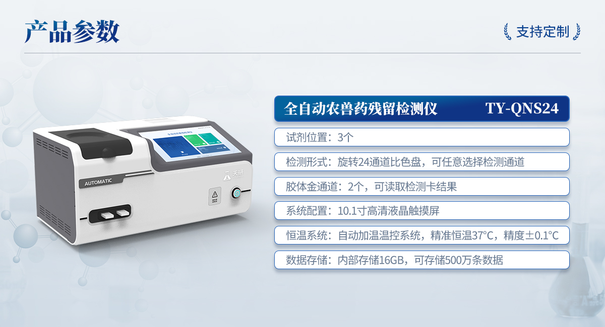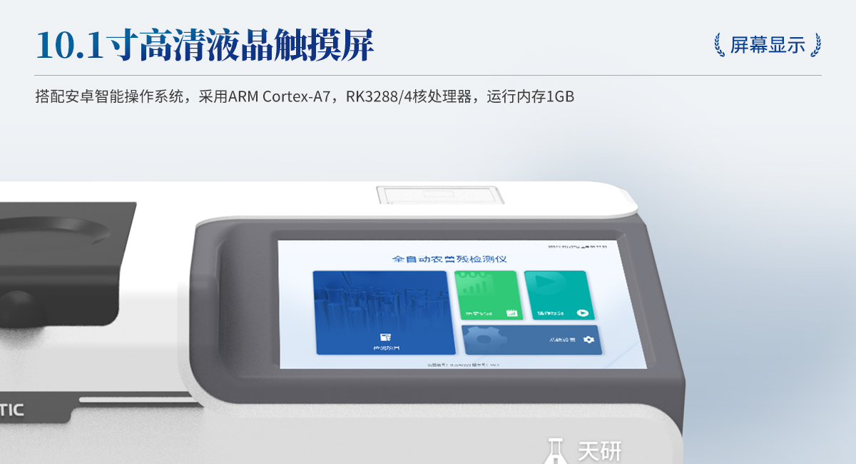 | 1. 試劑位置:3個 | 2. 農殘檢測盤:旋轉24通道比色盤,可任意選擇檢測通道,自動對應選擇通道。 | 3. 膠體金通道:2個,可讀取檢測卡結果,自動采集、處理分析,自動判斷檢測結果,并具備自動判空功能。 | 4.系統配置:10.1寸高清液晶觸摸屏,采用ARM Cortex?-A7,RK3288/4核處理器,運行內存1GB。Android7.1.1 系統分辨率1280×800。 | 5.恒溫系統:具有自動加溫溫控系統,精準恒溫37℃,精度±0.1℃。 | 6.添加系統:儀器按照試劑要求自動、按時、按量加入試劑,并且自動對未正常放置的樣本或異常的樣本進行檢查并提示。 | 7.清洗功能:儀器具備回流及自動清洗管路功能,避免試劑污染。 | 8.混勻功能:設備具備自動混勻功能。 | 9.光源校準:設備可自動校準,確保檢測準確度。 | 10.實時監(jiān)控:儀器測試過程中屏幕顯示運行狀態(tài),可實時查看。 | 11.數據存儲:內部存儲16GB,可存儲500萬條數據。 | 12.樣品多選功能:設備具備樣品一鍵多選功能,選擇樣品自動匹配檢測通道。 | 13.項目預設:可提前設置單個及多個相同或不相同的檢測任務,可單次或者多次調取,減少檢測時間。 | 14.自定義打印系統:內置自定義打印系統,可按需靈活設置開啟或關閉:產品合格證(國家農業(yè)部標準),二維碼,抽樣信息、檢測信息,受檢信息等信息的打印。 | 15.A4版本報告打印功能:設備可自動生成A4版報告,A4報告帶二維碼,可掃描二維碼生成電子版,并可識別真?zhèn)巍?/td> | 16.傳輸方式:儀器配備無線通信模塊: 4G(APN)通訊模塊、Wifi模塊,藍牙傳輸模塊,同時具有USB接口以及RJ45接口能以多種方式實現數據保存和數據傳輸功能,設備數據可以同步上傳至平臺。 | 17.系統17.數據監(jiān)管系統:設備自帶監(jiān)管平臺,并可同步對接監(jiān)管平臺,數據可局域網和互聯網數據上傳,檢測結果可直接傳至食品安全監(jiān)管平臺。達到食品安全問題預估、預警。 | 18.系統遠程更新功能:無需設備返廠,即可遠程實時升級全新系統,節(jié)省時間成本及避免運輸造成設備損。 |