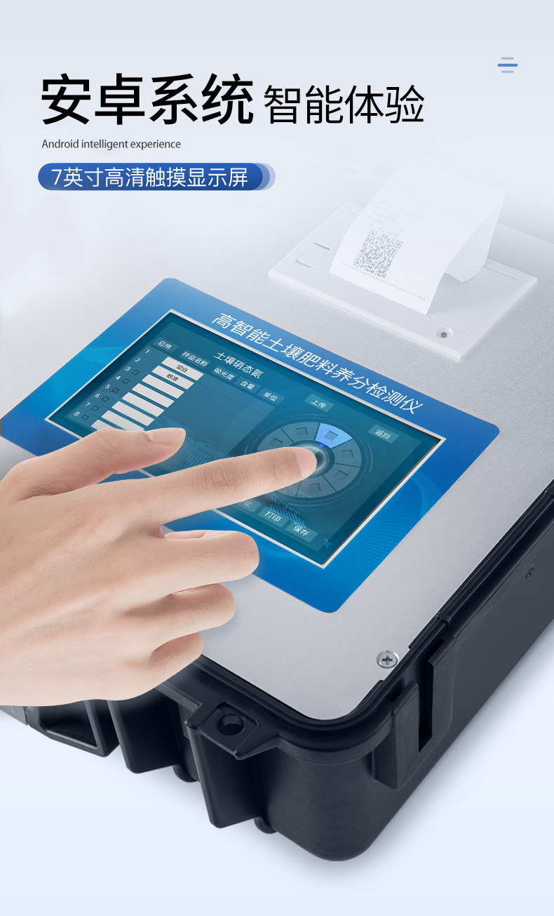| ★1、Android安卓智能操作系統(tǒng),主控芯片采用ARM Cortex-A7,RK3288/4核處理器,主頻1.88Ghz,運轉速度更快速,穩(wěn)定性更強。 | ★2、12個檢測通道,一次性可快速檢測12個樣品,極大提升檢測效率,降低檢測成本。 | ★3、采用高精度濾光片技術自主**分析方法(**號:ZL 2020 2 1763837.9),**認證。 | ★4、檢測過程中內(nèi)置校準功能,智能恒流穩(wěn)壓,光強自動校準,確保檢測準確度,取得中國計量科學研究院的《校準證書》。 | ★5、儀器標配wifi無線上傳、4G聯(lián)網(wǎng)傳輸、GPRS無線遠傳,快速上傳數(shù)據(jù)。 | ★6、配有智慧云農(nóng)業(yè)平臺,儀器連入無線網(wǎng)絡后,可將檢測數(shù)據(jù)可選擇性或批量無線上傳,方便用戶進行長期數(shù)據(jù)管理和可視化分析。 | 7、儀器配同時具有USB接口、以太網(wǎng)接口,內(nèi)置大容量內(nèi)存,并可隨時用U盤拷貝數(shù)據(jù)。 | ★8、可用手機隨時登錄云平臺在線移動查看歷史數(shù)據(jù) | ★9、內(nèi)置作物專家施肥系統(tǒng),可對百余種全國農(nóng)業(yè)經(jīng)濟作物、果樹等的目標產(chǎn)量計算推薦施肥量,依據(jù)施肥配方科學指導農(nóng)業(yè)生產(chǎn)。測土配方施肥結果可打印,打印內(nèi)容包含:作物種類、肥料種類、目標產(chǎn)量、需求總量、建議施肥方案。 | 10、內(nèi)置植物營養(yǎng)診斷標準圖譜,根據(jù)各農(nóng)作物營養(yǎng)缺失的圖片,進行葉面對比,診斷豐缺。 | ★11、4波長專業(yè)測試冷光源(紅、藍、綠、橙),光源波長穩(wěn)定,長時間連續(xù)工作光源無溫漂現(xiàn)象,壽命長達10萬小時級別,重現(xiàn)性好,準確度高。 | 12、比色池部分采用標準1cm比色皿,無機械位移及磨損,光路測試定位**,有效屏蔽外光干擾,保證檢測結果優(yōu)于國標要求。 | ★13、儀器系統(tǒng)內(nèi)帶有樣品前處理操作視頻,各種樣品檢測方法點擊視頻模塊即可觀看,檢測人員無需自學說明書,指導教學方便快速,方便新手快速操作。 | 14、內(nèi)置新一代高速熱敏打印機(無需色帶),打印內(nèi)容包含:檢測單位、檢測人員、檢測項目、通道號、吸光度、養(yǎng)分含量(mg/kg)、檢測時間、以及二維碼等信息 | ★15、高靈敏7寸真彩觸摸屏,采用更加**和人性化操作,高清晰高交互顯示,大程度降低傳統(tǒng)儀器的繁瑣操作和失誤,并取得多項《軟件著作權》。 | 16、內(nèi)置時鐘功能,方便操作時間記錄,長期歷史追溯。 | 17、可設置多賬戶賬號密碼登錄,**UI交互界面,不同的用戶可自由添加編輯檢測信息,保存后可長期使用。 | 18、GPS功能:可在野外作業(yè)時記錄經(jīng)緯度地點,滿足特殊用戶需求。 | 19、內(nèi)置低電壓提示功能,可在檢測時明確電量,避免測試數(shù)據(jù)偏移,同時具有斷電保護功能,斷電自動保存數(shù)據(jù),防止數(shù)據(jù)丟失。 | 20、交直流兩用供電方式,內(nèi)置大容量充電鋰電池,滿電狀態(tài)下可連續(xù)工作10余小時,同時可外接車載電源蓄電。 | ★21、儀器具有中英文切換功能,可滿足出口要求。 | 22、高強度PVC工程塑料手提箱設計,堅固耐用,便于攜帶。 |