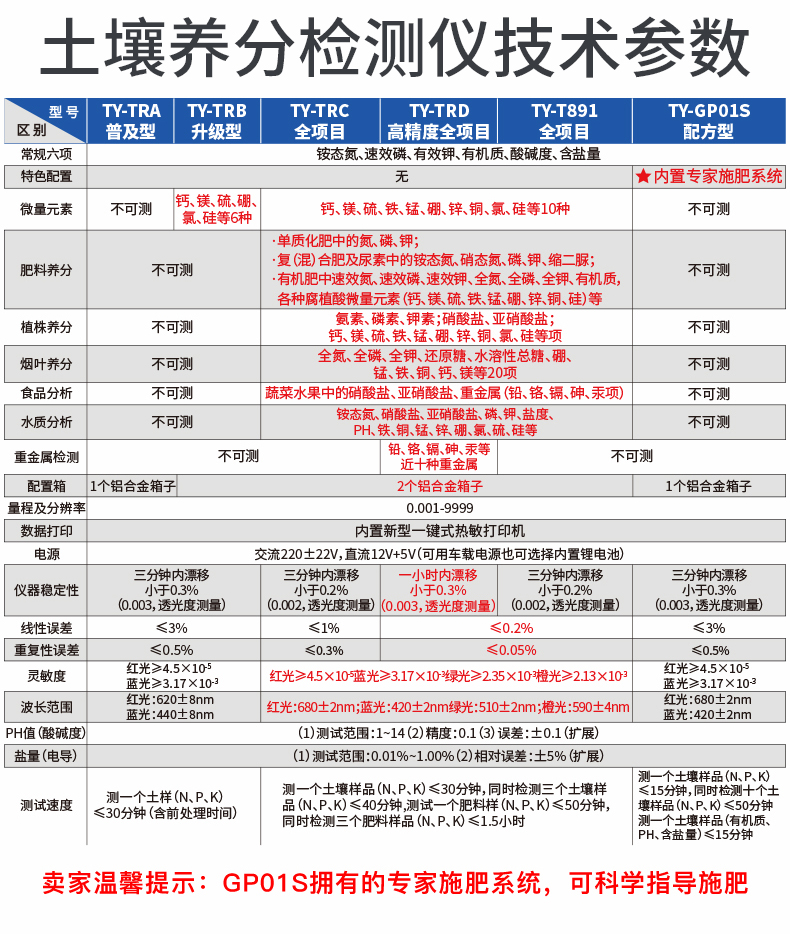 | 配套齊全:該儀器集藥、器、儀為一體,攜帶方便,相當于一個小型移動實驗室,無需用戶自配附件,亦可靈活野外流動測試。適于農(nóng)業(yè)服務部門或農(nóng)資經(jīng)銷商、高教院校、科研院所、合作社、肥料廠商、大種植戶測土施肥和鑒別肥料真假及環(huán)保檢測應用。 | 檢測功能全:測試項目國內(nèi)外全面,除標配試劑外,其他各類藥劑均可加配選購。 | 操作簡便、速度快捷,配套整套附件及成品藥劑開瓶即用,無須配置。 | 性能可靠:工作穩(wěn)定性優(yōu)于國家標準JJG179-90指標的6倍,重復性達到光柵型分光光度計指標水平。 |