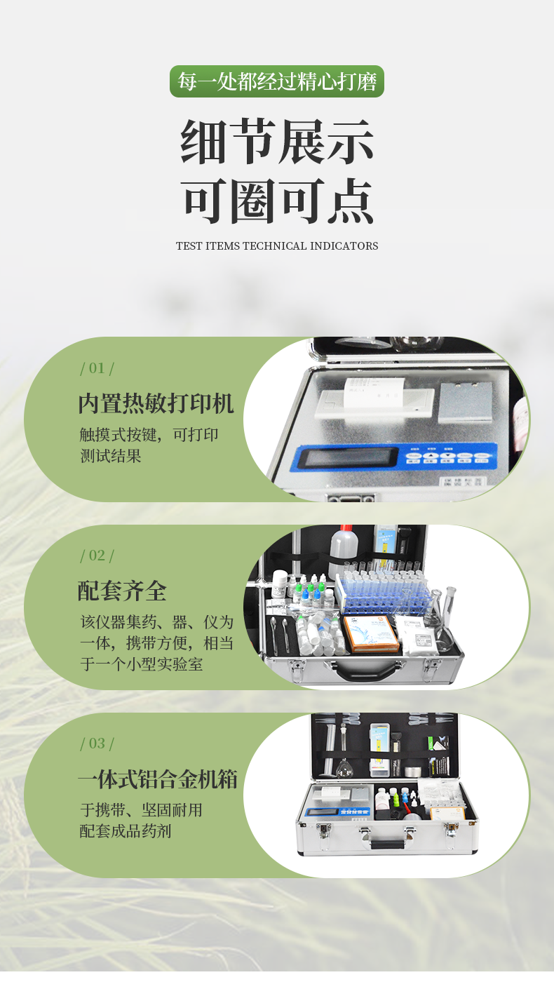 | 1、《機(jī)箱/藥劑一體式鋁合金機(jī)箱》設(shè)計(jì),便于攜帶、堅(jiān)固耐用,配套成品藥劑。 | 2、微電腦控制,數(shù)字化線路、程序化設(shè)計(jì),液晶顯示,交直流兩用,可野外流動(dòng)測(cè)試,**程度降低操作者的失誤和勞動(dòng)強(qiáng)度。 | 3、分辨率:0.001,觸摸式按鍵,內(nèi)置熱敏打印機(jī),可打印測(cè)試結(jié)果。 | 4、可檢測(cè)土壤及化肥、有機(jī)肥、植株中的速效氮、有效磷、速效鉀、全氮、全磷、全鉀、有機(jī)質(zhì)含量,土壤酸堿度,含鹽量,以及土壤鈣、鎂、硫、硼、氯、硅等6種中微量元素。 | 5、采用高亮度 LED 燈作為光源, 硅半導(dǎo)體作為信號(hào)接收系統(tǒng), 壽命長(zhǎng)達(dá)10萬(wàn)小時(shí)級(jí)別。光源穩(wěn)定,一致性好。 | 6、比色槽部分采用單通道、雙光路設(shè)計(jì),無(wú)機(jī)械位移及磨損,光路測(cè)試定位**,保證測(cè)定結(jié)果精度。 |