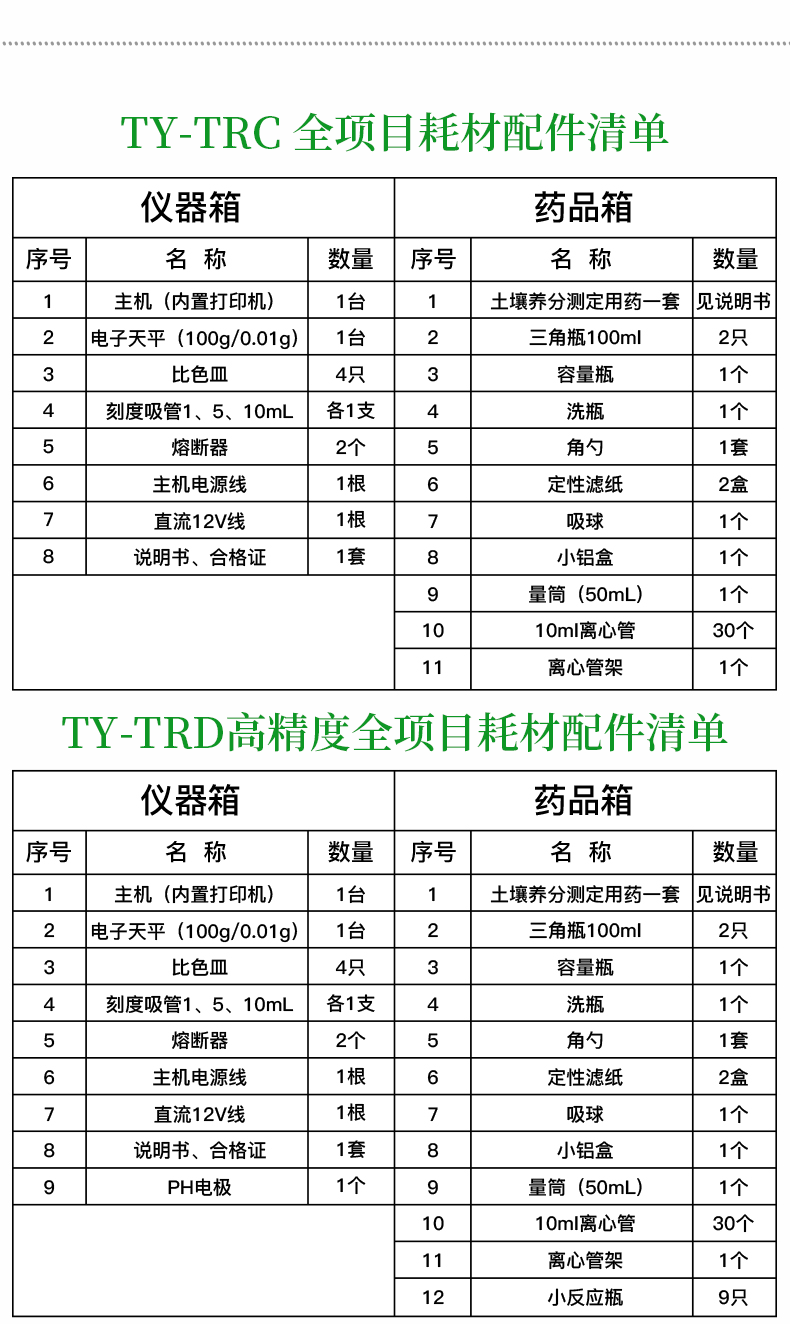 | 藥 品 箱 | 土壤養(yǎng)分測(cè)定用藥 :1套/100次 | 三角瓶100ml :2只 | 容量瓶 :1個(gè) | 洗瓶 :1個(gè) | 角勺 :1套 | 定性濾紙 :1盒 | 吸球 :1個(gè) | 小鋁盒 :1個(gè) | 量筒(50mL) :1個(gè) | 10ml離心管 :30個(gè) | 離心管架 :1個(gè) |
