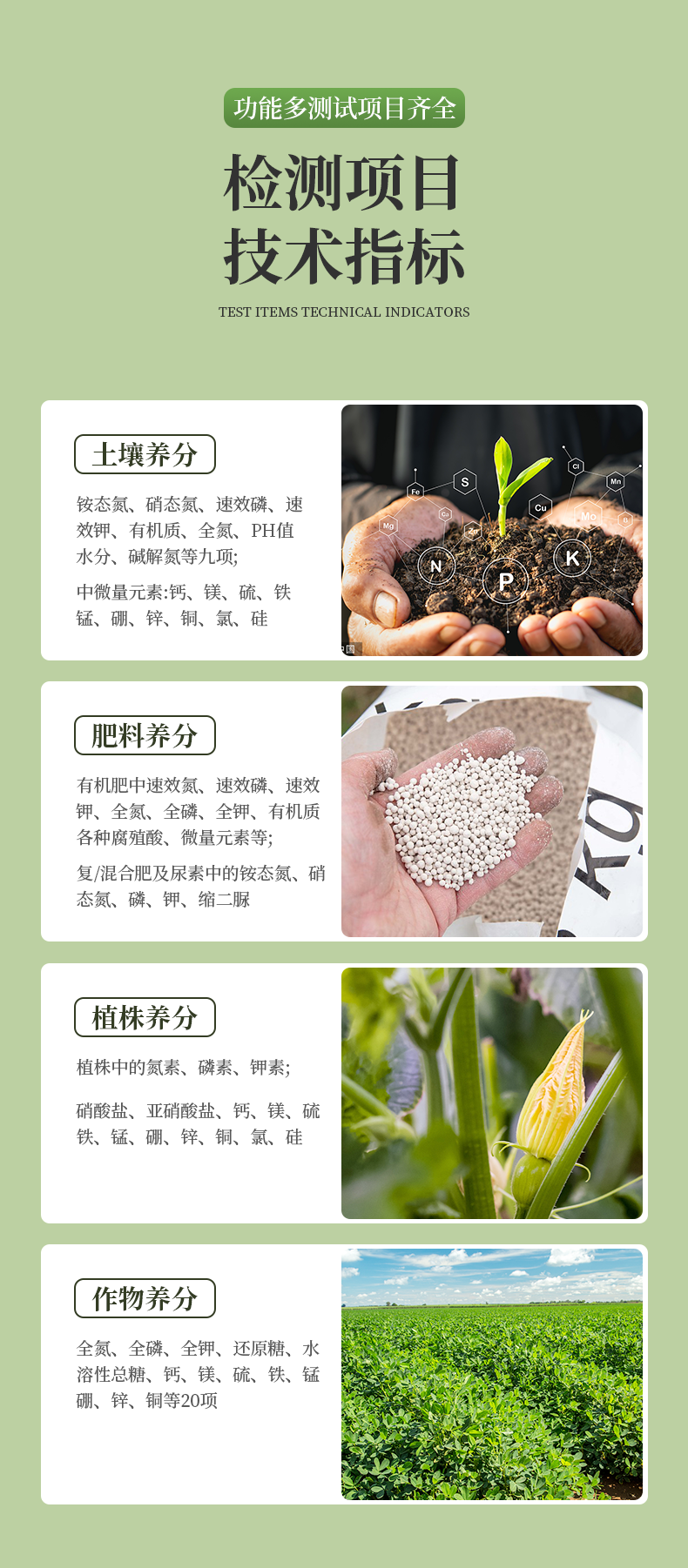 土壤養(yǎng)分: ●銨態(tài)氮、硝態(tài)氮、速效磷、速效鉀、有機(jī)質(zhì)、全氮、堿解氮、pH值、含鹽量、水分等十項(xiàng); ● 中微量元素:鈣、鎂、硫、鐵、錳、硼、鋅、銅、氯、硅、鉬等。 |