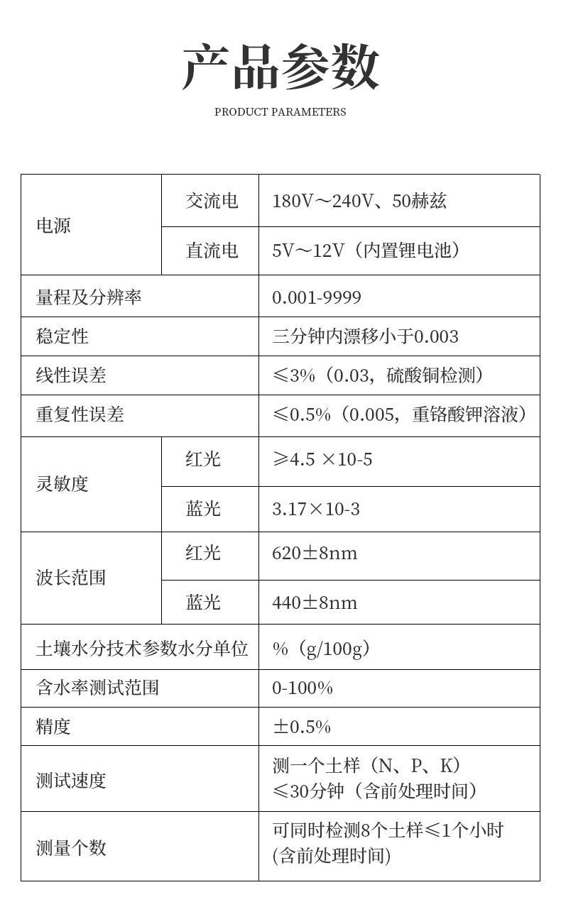 | 測一個土壤樣品(N、P、K)≤30分鐘,同時檢測三個土壤樣品(N、P、K)≤40分鐘; | 測試一個肥料樣(N、P、K)≤50分鐘,同時檢測三個肥料樣品(N、P、K)≤1.5小時。 |