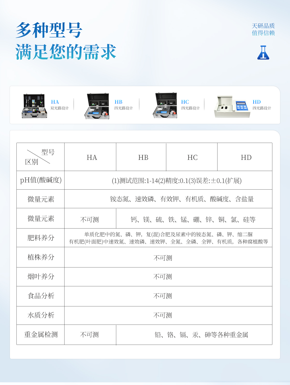 | 肥料養(yǎng)分:● 單質(zhì)化肥中的氮、磷、鉀; ● 復(混)合肥及尿素中的銨態(tài)氮、硝態(tài)氮、磷、鉀、縮二脲; ● 有機肥(葉面肥)中速效氮、速效磷、速效鉀、全氮、全磷、全鉀、有機質(zhì),各種腐植酸等。可擴展檢測鈣、鎂、硫、鐵、錳、硼、鋅、銅、氯、硅等微量元素以及各種重金屬(鉛鉻鎘汞砷)。 |