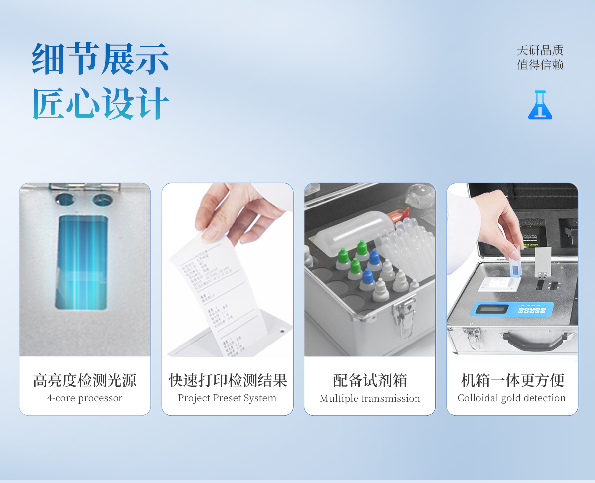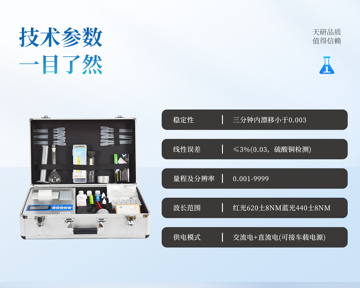 | 《機箱/藥劑一體式鋁合金機箱》專業(yè)設(shè)計,便于攜帶、堅固耐用,配套成套附件及成品藥劑 | 微電腦控制,數(shù)字化線路、程序化設(shè)計,液晶顯示,交直流兩用,可野外流動測試。 | 分辨率:0.001,觸摸式按鍵,內(nèi)置新一代熱敏打印機,可打印測試結(jié)果。 | 可檢測化肥、有機肥(含葉面肥、水溶肥、噴施肥等)中的速效氮、速效磷、有效鉀、全氮、全磷、全鉀、有機質(zhì)、酸堿度,鈣、鎂、硫、鐵、錳、硼、鋅、銅、氯、硅等各種中微量元素以及鉛、鉻、鎘、汞、砷等各種重金屬含量。 | 采用高亮LED燈光源、雙撥輪濾光式處理技術(shù),保證光源波長穩(wěn)定, 硅半導體作為信號接收系統(tǒng),壽命長達10萬小時級別。光源穩(wěn)定,重現(xiàn)性好,準確度高。 | 比色槽部分采用單通道設(shè)計,無機械位移及磨損,光路測試定位**,保證測定結(jié)果精度。 | 采用高精度濾光片技術(shù),自主分析方法,保證檢測結(jié)果優(yōu)于國標要求。 | 肥料打印結(jié)果為百分含量,測試誤差小于0.5%。 |