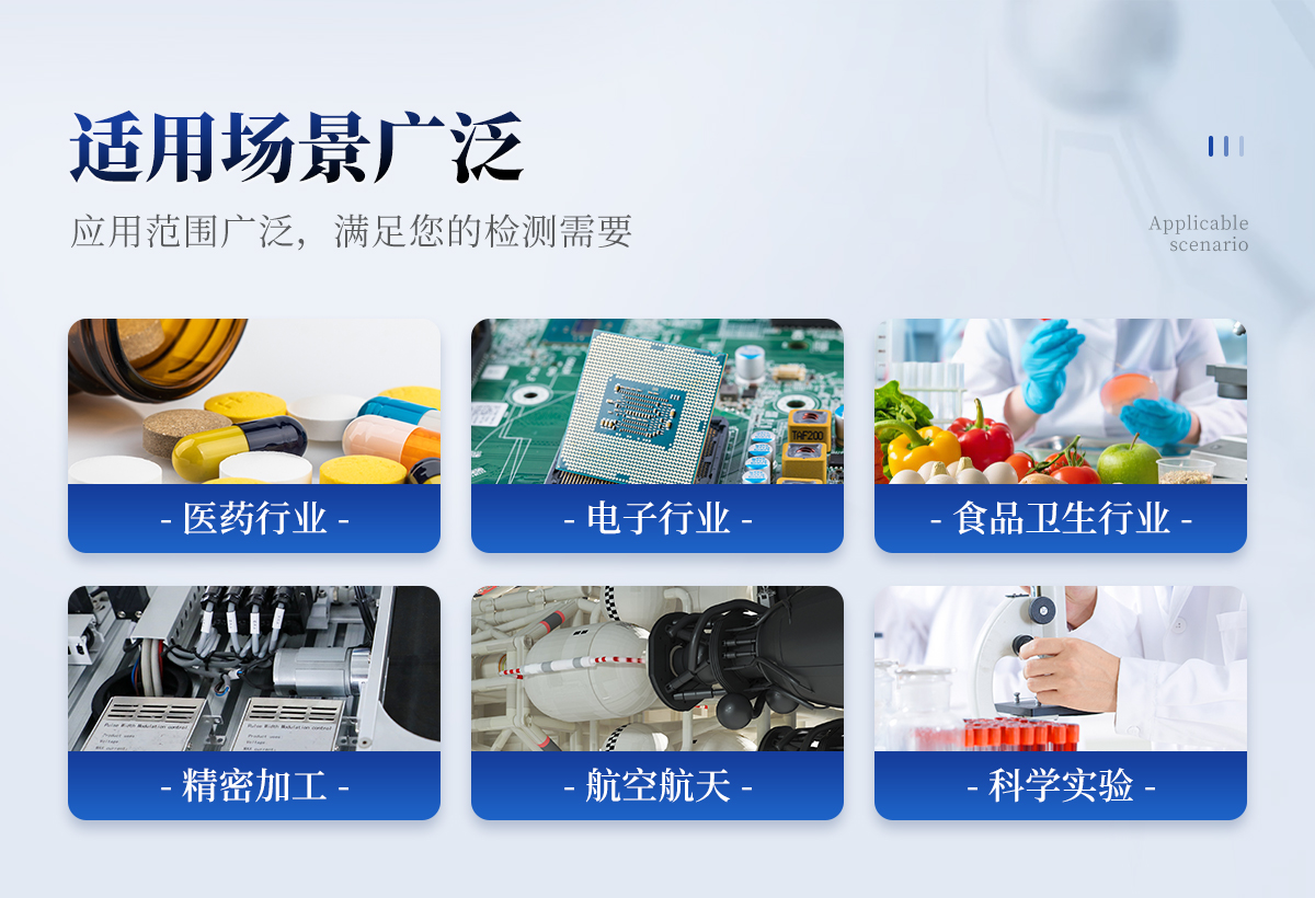 滿足醫(yī)藥行業(yè)(制藥廠、藥檢所、醫(yī)院手術(shù)室等);電子行業(yè)(半導體工廠、精密機械的生產(chǎn)加工等);食品衛(wèi)生行業(yè)(乳制品、塑封肉食品、調(diào)味食品、農(nóng)產(chǎn)品等的精加工);過濾器的生產(chǎn)廠家,檢驗過濾器的質(zhì)量及效率等;光學、及航空航天等領域的精加工、精密試驗所需的潔凈室(區(qū))的檢測需要。
