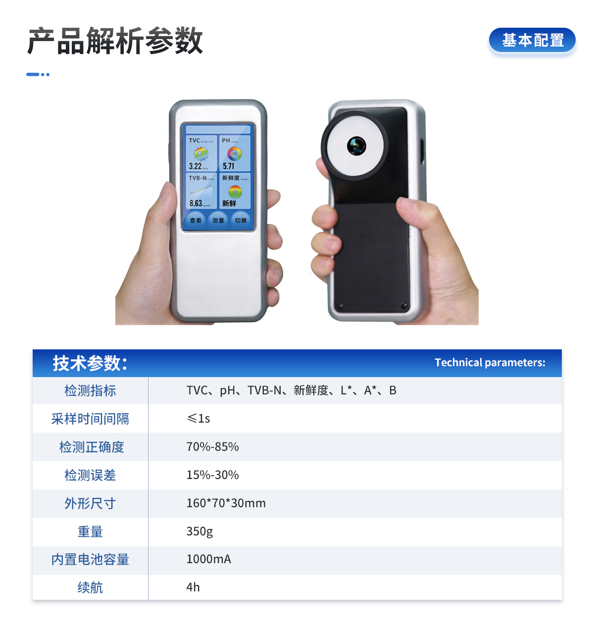 | 1. ※檢測指標(biāo):TVC、pH、TVB-N、新鮮度、L*、A*、B | 2. 采樣時間間隔:≤1s | 3. 檢測正確度:70%-85% | 4. 檢測誤差:15%-30% | 10. 外形尺寸:160*70*30mm | 11. 重量:350g | 12. 內(nèi)置電池容量:1000mA | 13. 續(xù)航:4h |