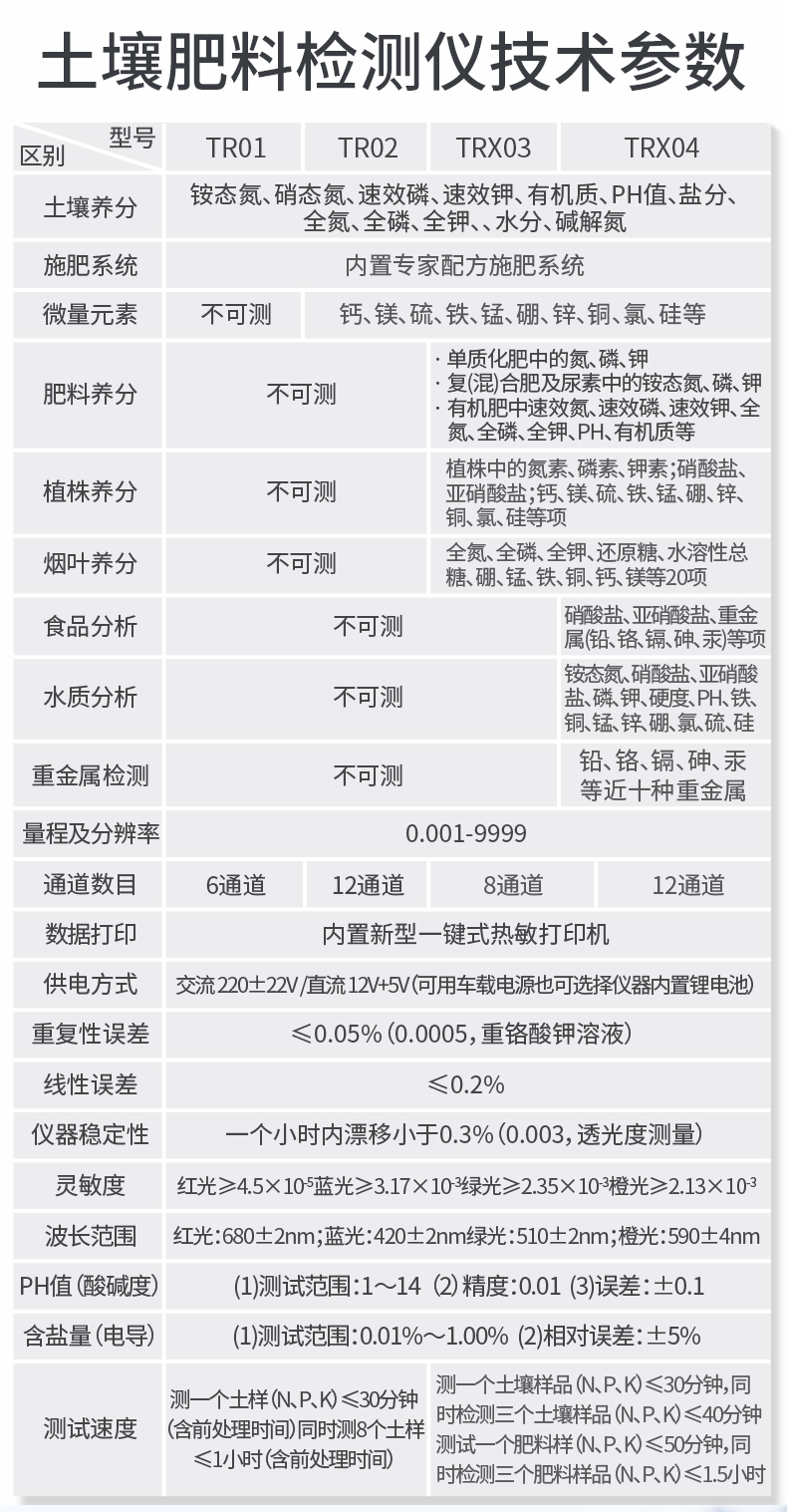 | 儀器測定項目:測定土壤、肥料、食品、蔬菜、水果中重金屬(鉛、砷、鉻、鎘、汞、鐵、鋅、錳、銅)。 | 儀器擴展測試項目:儀器可以擴展測定土壤、肥料養(yǎng)分含量。 |