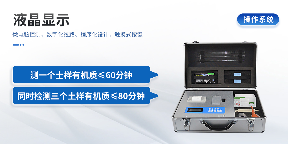 | 土壤養(yǎng)分速測儀可同時檢測8個樣品; | 測一個土樣有機質(zhì)≤60分鐘,同時檢測三個土樣有機質(zhì)≤80分鐘。 |