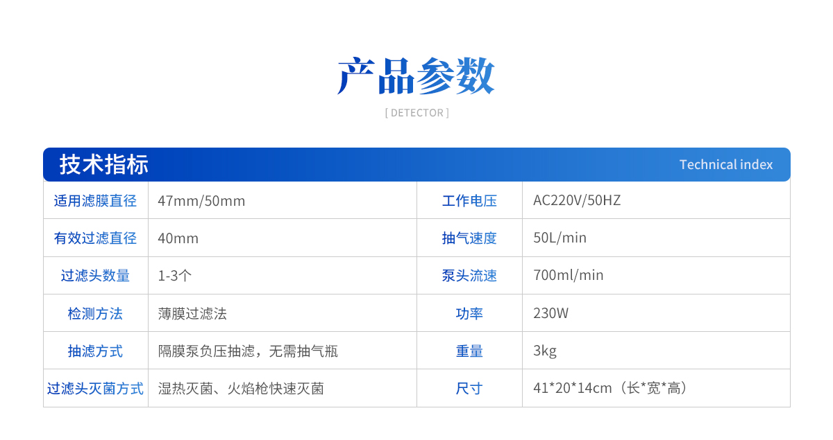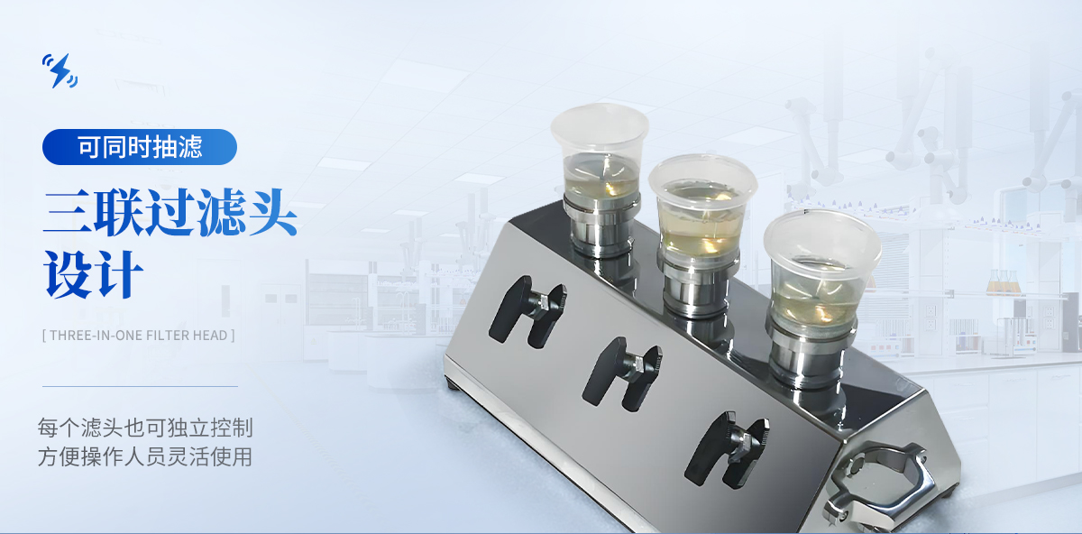| 1、適用濾膜直徑:47mm/50mm 2、有效過濾直徑:40mm 3、過濾頭數(shù)量:1-3個; 4、檢測方法:薄膜過濾法 5、抽濾方式:隔膜泵負(fù)壓抽濾,無需抽氣瓶 6、過濾頭滅菌方式:濕熱滅菌、火焰槍快速滅菌 7、尺寸:41*20*14cm(長*寬*高) 8、重量:3kg 9、功率:230W 10、工作電壓:AC220V/50HZ 11、噪音小于30dB 12、物理按鈕開關(guān) 13、可選擇單頭、三頭結(jié)構(gòu),選型豐富 14、抽氣速度:50L/min 15、泵頭流速:700ml/min |