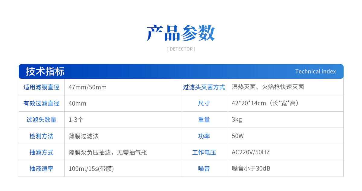 | 1、適用濾膜直徑:47mm/50mm 2、有效過濾直徑:40mm 3、過濾頭數(shù)量:1-3個 4、檢測方法:薄膜過濾法 5、抽濾方式:隔膜泵負(fù)壓抽濾,無需抽氣瓶 6、抽液速率:100ml/15s(帶膜) 7、過濾頭滅菌方式:濕熱滅菌、火焰槍快速滅菌 8、尺寸:42*20*14cm(長*寬*高) 9、重量:3kg 10、功率:50W 11、工作電壓:AC220V/50HZ 12、噪音小于30dB 13、物理按鈕開關(guān) 14、可選擇三頭、六頭結(jié)構(gòu),選型豐富 |