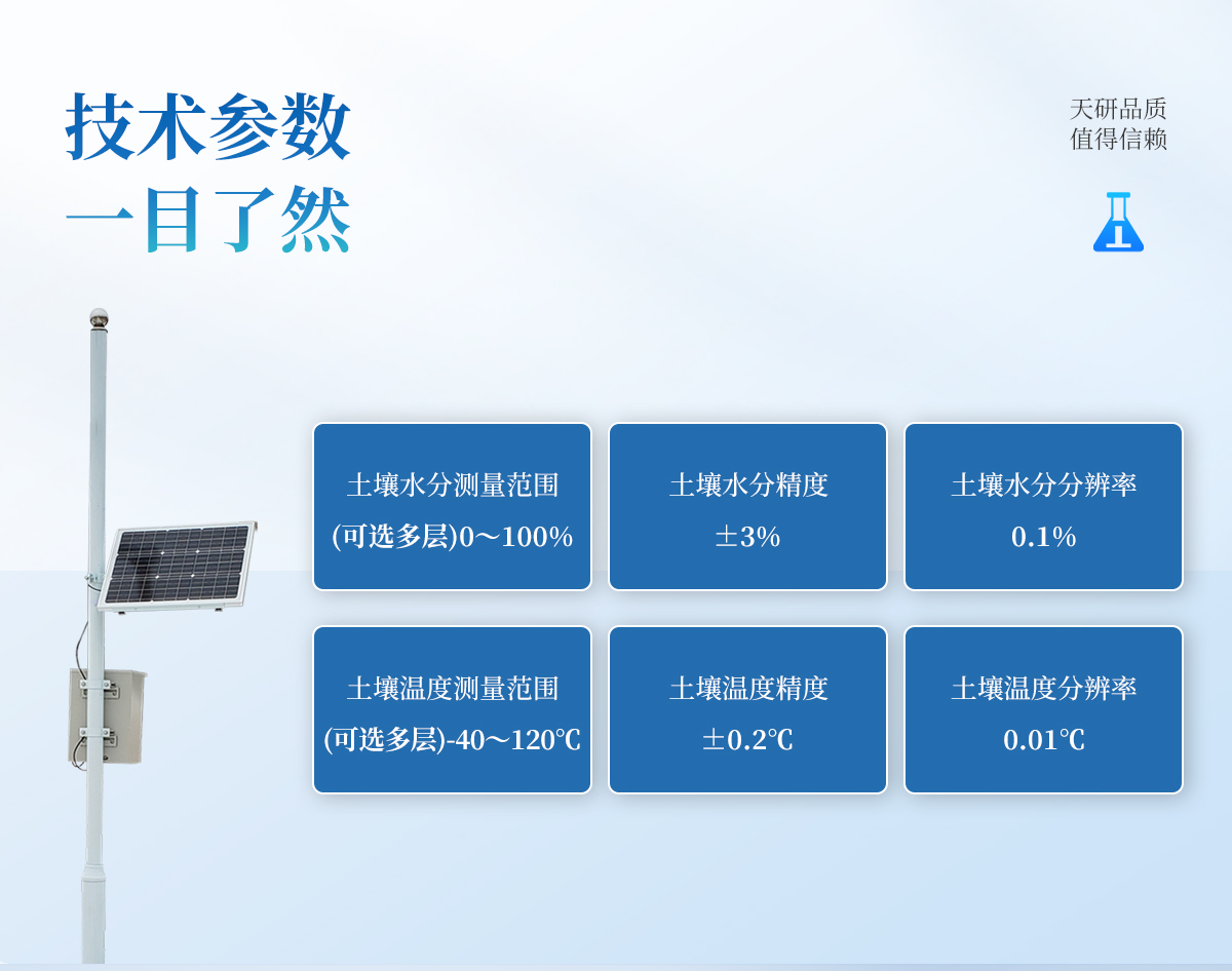 | 主控制器技術(shù)參數(shù) 數(shù)據(jù)存儲空間:≥100000條 記錄間隔:1分-24小時可調(diào) 數(shù)據(jù)傳輸:無線傳輸 工作環(huán)境:-30℃~80℃ 供電方式:220v市電、太陽能供電系統(tǒng)同時使用 | 傳感器技術(shù)參數(shù) 空氣濕度:0~100% 精度:±3% 分辨率:0.1% 光照 :-20~80℃ 精度:±2% 雨量 :-20~80℃ 承雨口徑:φ200mm 精度:±2% 分辨率:0.2mm 土壤水分:測量精度:±3% 工作溫度范圍:-20℃~50℃ 土壤ec:測量精度:±4% 土壤EC測量范圍:0.2~12mS/cm 土壤溫度:精度:±0.2℃ 測量范圍:-40℃~120℃ |