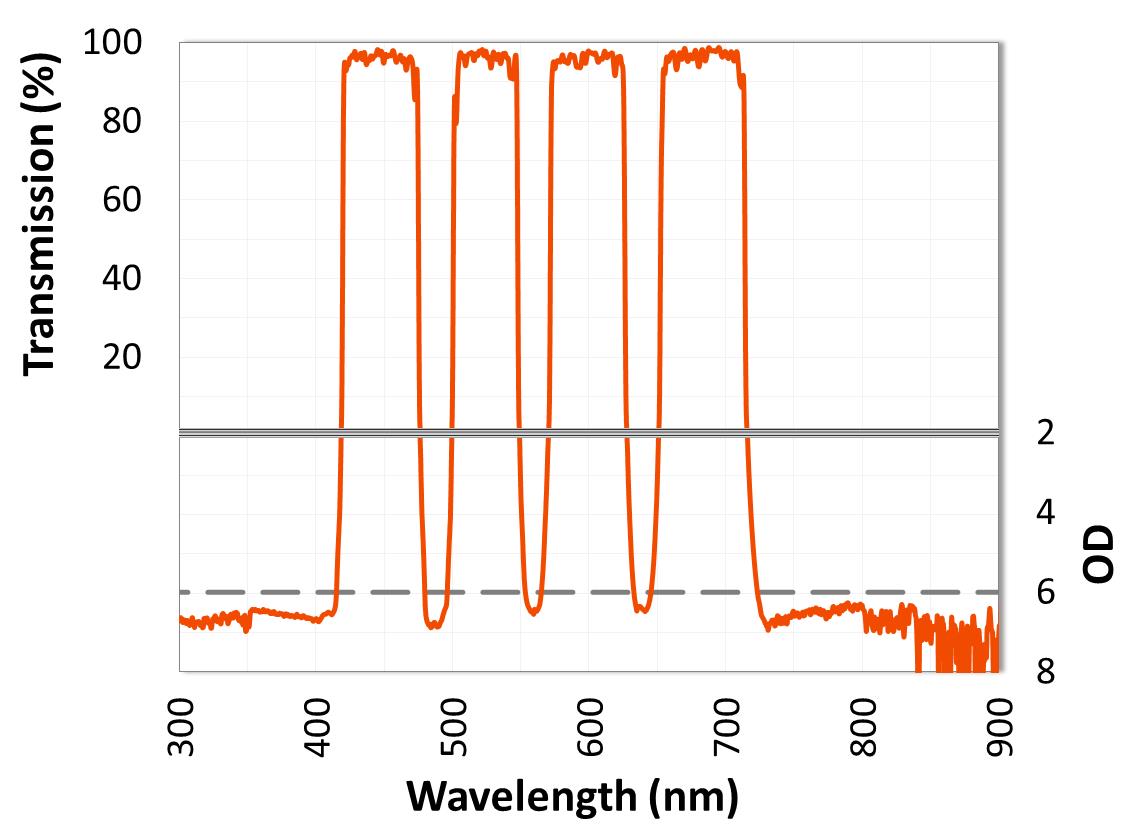 ULTRA系列多頻帶通濾光片可以設(shè)計(jì)為10個(gè)以上的透過(guò)波段,波段之間的OD值大于8,超高的截至陡度,高達(dá)98%的透過(guò)率。 它們非常適合用作熒光技術(shù)中的激發(fā)或發(fā)射濾光片,要求在單個(gè)樣本中同時(shí)檢測(cè)多個(gè)熒光團(tuán)。